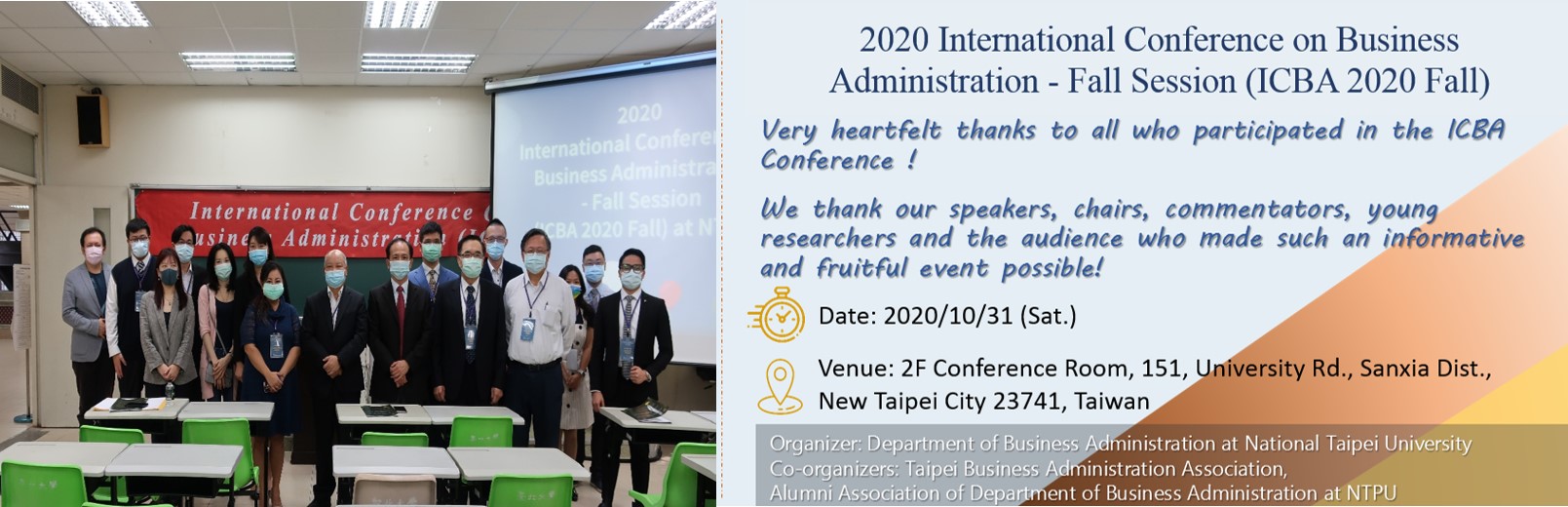 2021 International Conference on Business Administration (ICBA 2021) at National Taipei University (NTPU) calls for English papers in the field of management, emphasizing innovative and interesting issues. As a prestigious academic conference, ICBA 2021, organized by Department of Business Administration at National Taipei University, has become an important event for academic researchers, practical experts, professors, Ph.D. and master students, managers, decision makers, and so on.