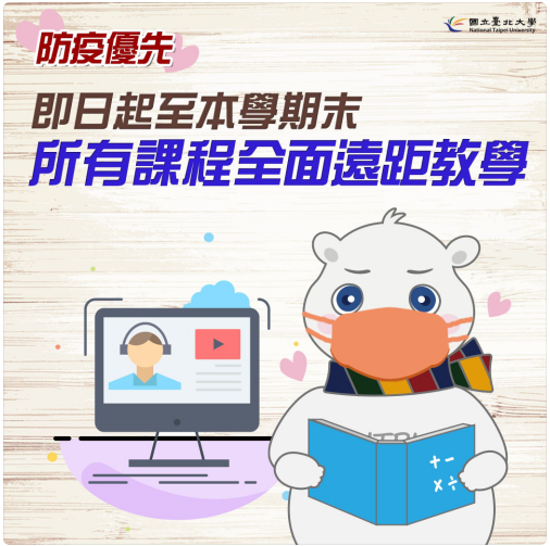 因應國內疫情現況,國立臺北大學遠距教學延至本學期末。期末考、畢業典禮等相關細節,由教務處及學務處等單位另行公告。