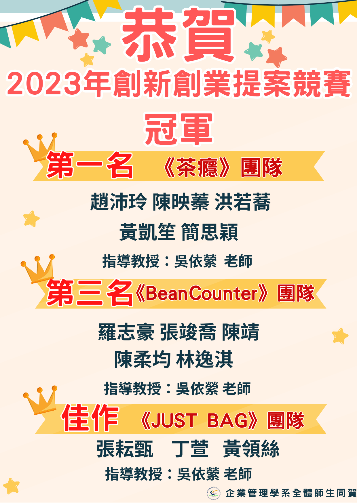 【恭賀】吳依縈老師指導企管系學生榮獲《2023年創新創業提案競賽》冠軍!