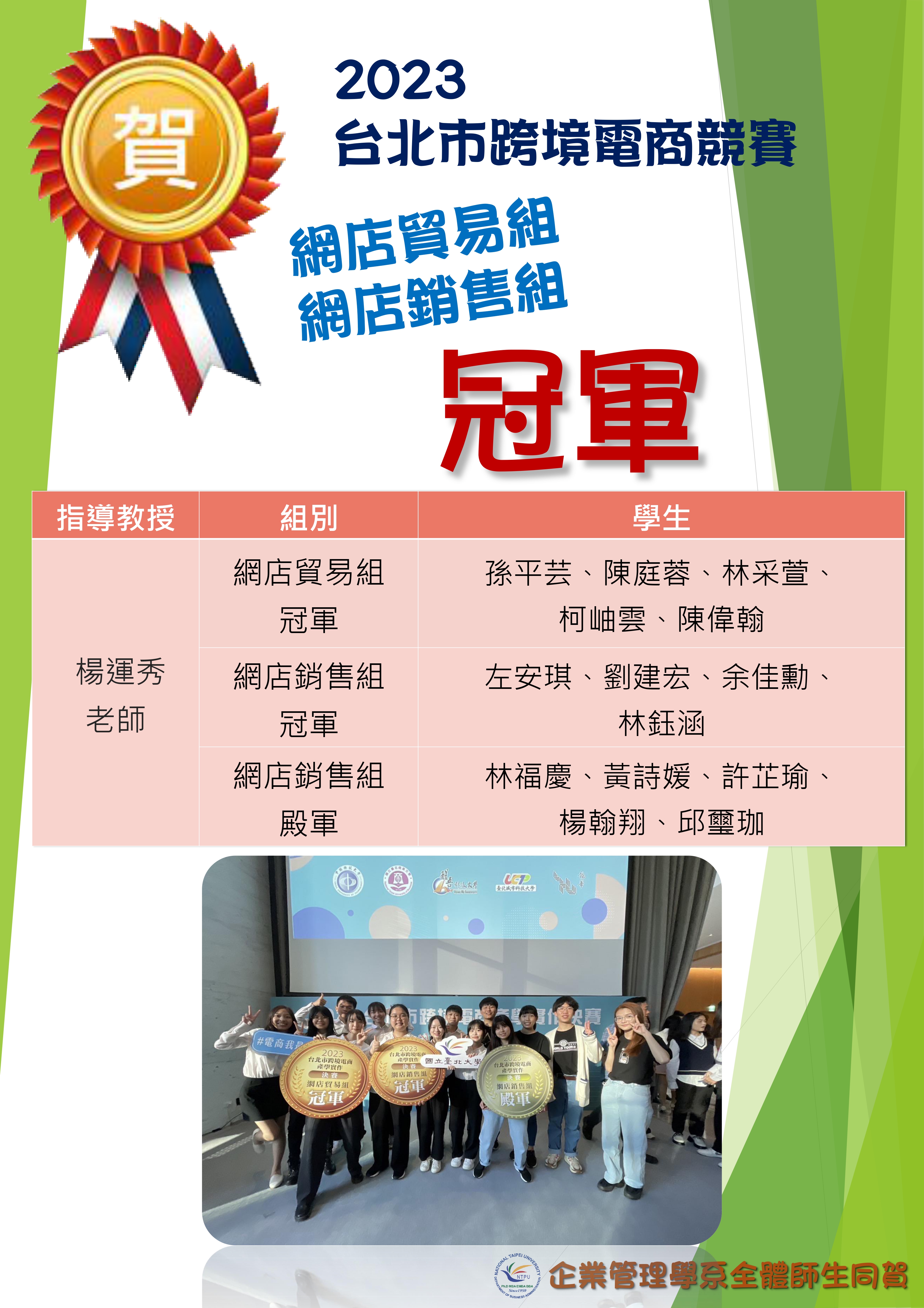 【恭賀】楊運秀老師指導企管系學生榮獲《2023台北市跨境電商競賽》雙組冠軍!