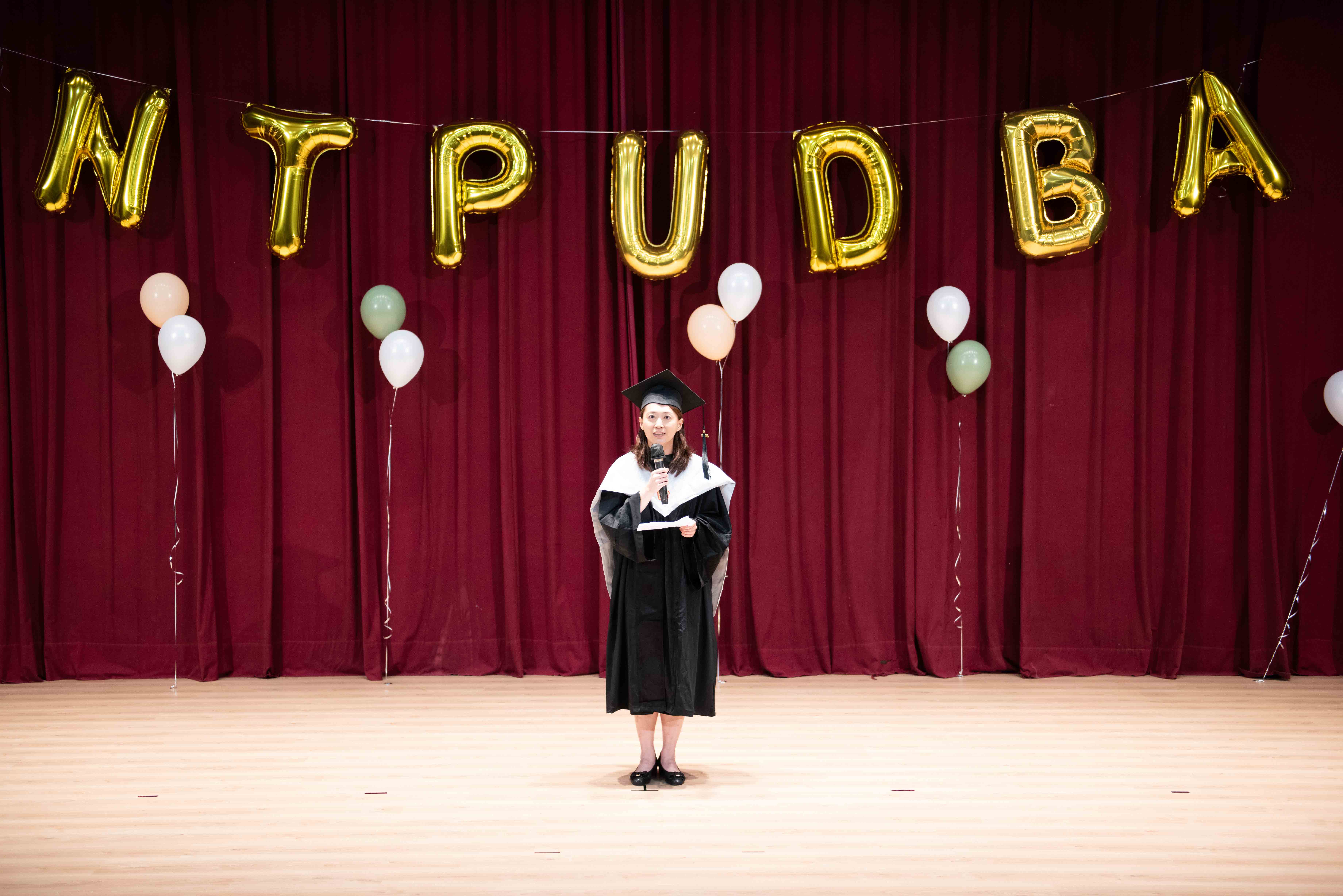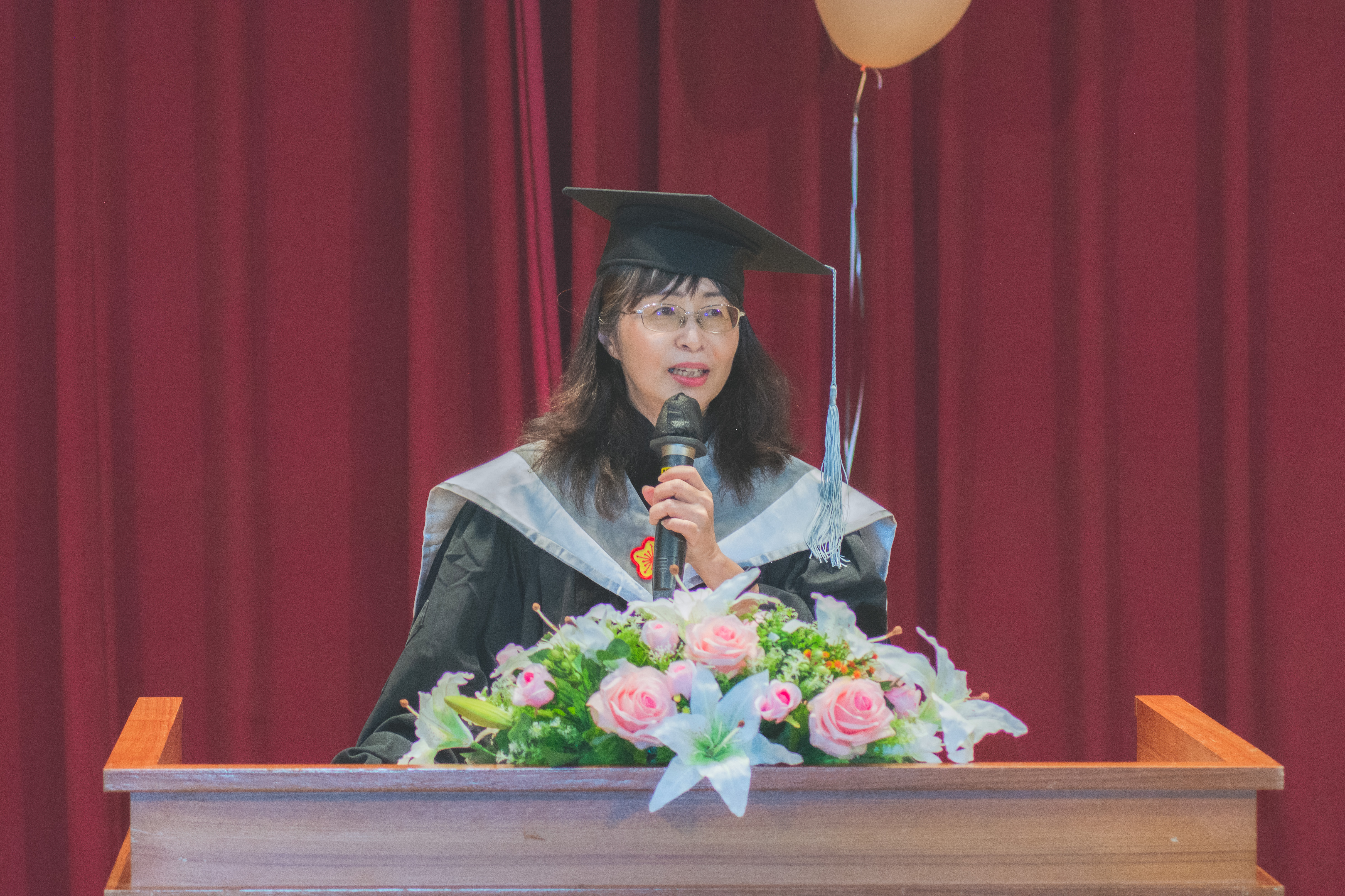 第五位是碩士班在職畢業生代表-許瀚云,她首先恭喜畢業生及所屬親友,你們的先生/太太、孩子回來了!也感謝臺北大學提供這樣的學制,滿足大家的求知慾之外也要莫忘初衷,雖然是在職生,但要如同全職學生一樣認真的求學態度,隨時歸零、重新學習,這些學習或許不會很快地轉化成財富或是成就,但奠定了管理思維和視野大格局。感謝老師們的春風化雨,灌溉許多養分,請與會來賓給老師們大大的掌聲,祝福畢業生們鵬程萬里、成就非凡。緊接著是碩士班畢業生代表-陳曄萱致詞,回想過去這一個月時間過得好快,在趕作業交報告、與教授討論修改論文中度過,這樣充實的日子也是專屬於青春的回憶,提醒畢業生無論做什麼工作、贏得什麼成就、遭遇何種挫折,都不要忘記自己的價值,並感謝師長們教會大家如何用管理面、行銷面、財務面、數據分析去解構這個世界,學會批判性思考,學會用深入淺出的方法表達自己,最後也感謝一起修改論文、吃飯聊天、互相打氣的朋友,更要感謝父母、家人,祝福各位都能成為正直良善、勇於承擔責任的人。