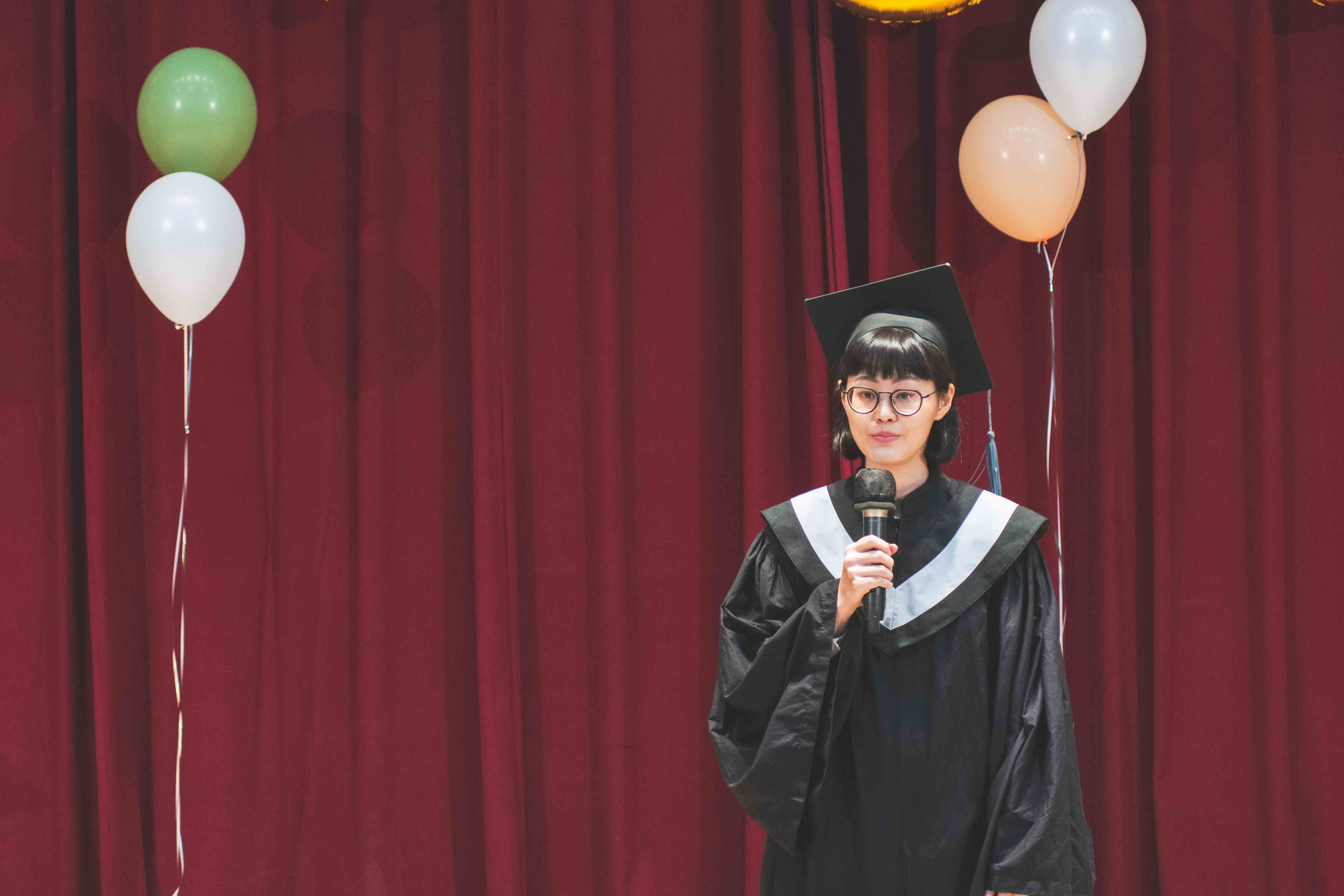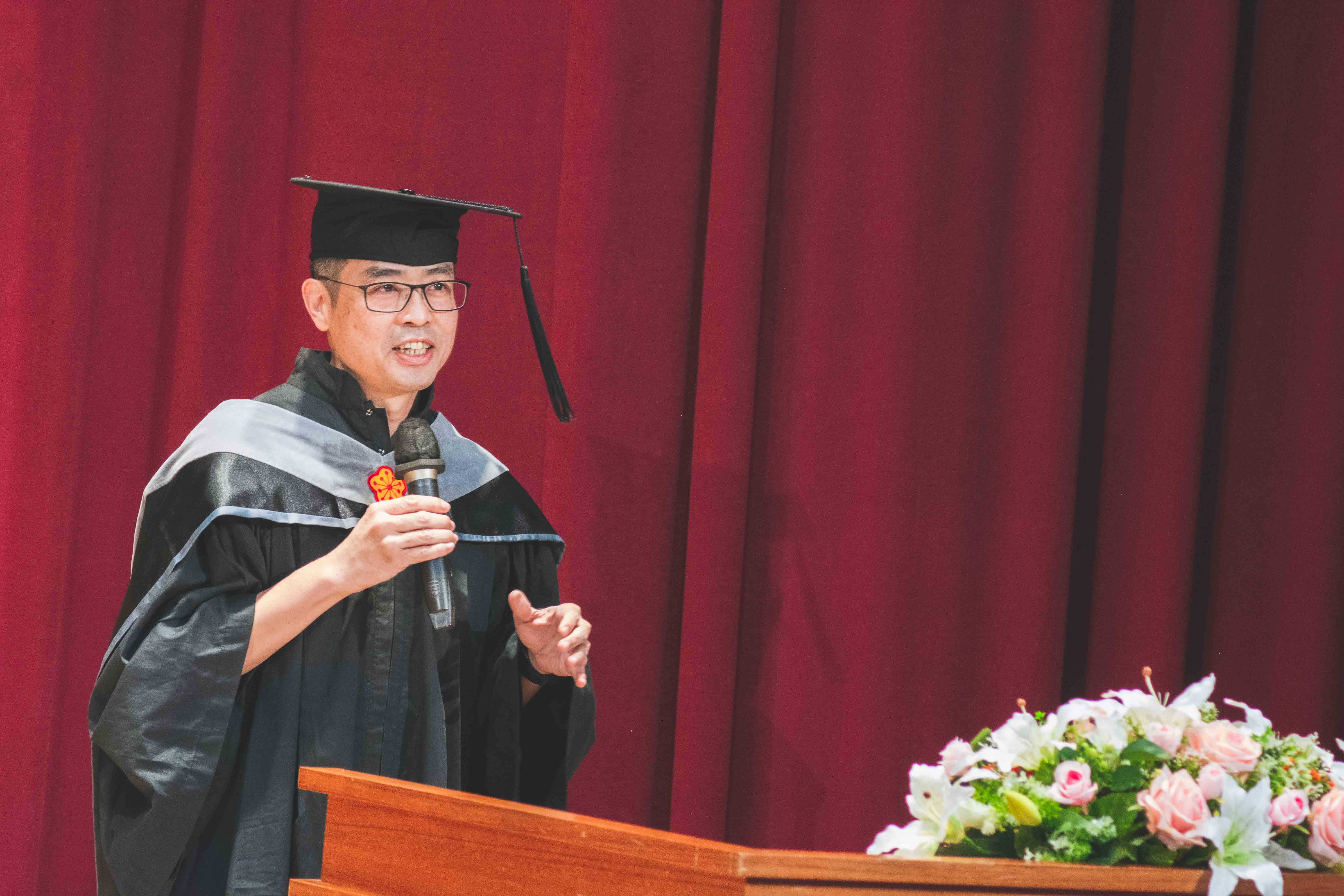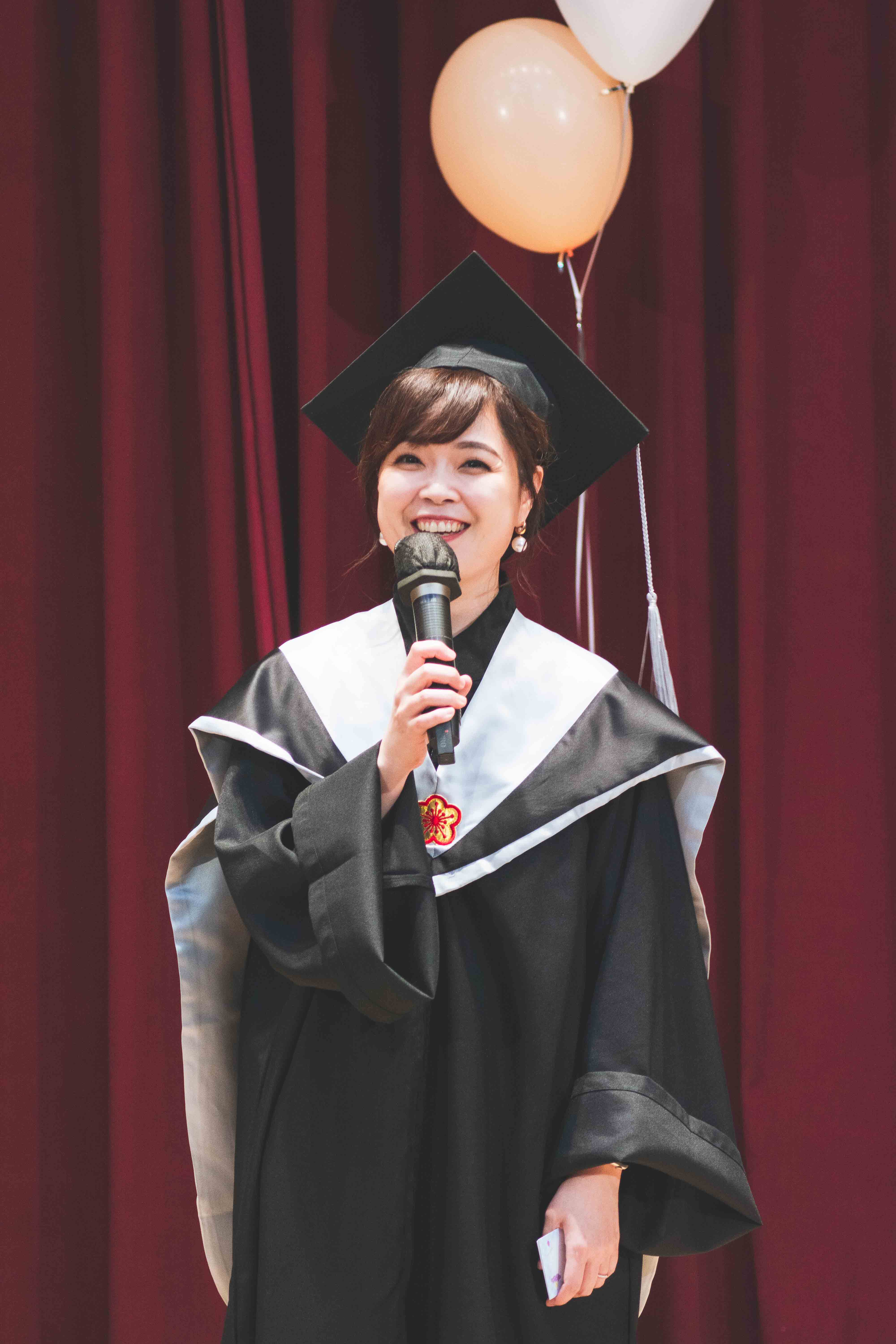 本系今年共有八位畢業生代表上台致詞,首先是博士班畢業生代表-謝友甄,她向大家分享「吸引力法則」,想像著自己的論文數據跑出來都非常完美、每次meeting教授都很滿意,最後終於能參加畢業典禮,要將吸引力法則成功地實現,需要把每個畫面想像得鉅細靡遺。此外,回憶起在飛機上苦讀學術文獻,下飛機就直接到臺北校區上課的日子,以村上春樹的「跑馬拉松是一種修行」,攻讀博士學位可說是修行的一種,很幸運在這六年的修行路上有各位師長與學長姐的相伴,祝福在座的各位成為更好的人。第二位是EMBA畢業生代表-殷士偉,感謝所有的師長及班上同學,在歷經疫情封城與遠距上課,大家仍然一起完成學業。他舉出在當代管理論談課程中提到的「重新將片段的知識系統化」,這是他唸EMBA很重要的目標,感謝人生道路所遇到的良師益友,幫助他達成目標,人生中有很多困難,做了不一定有,但不做一定沒有,期許大家能夠迎難而上。