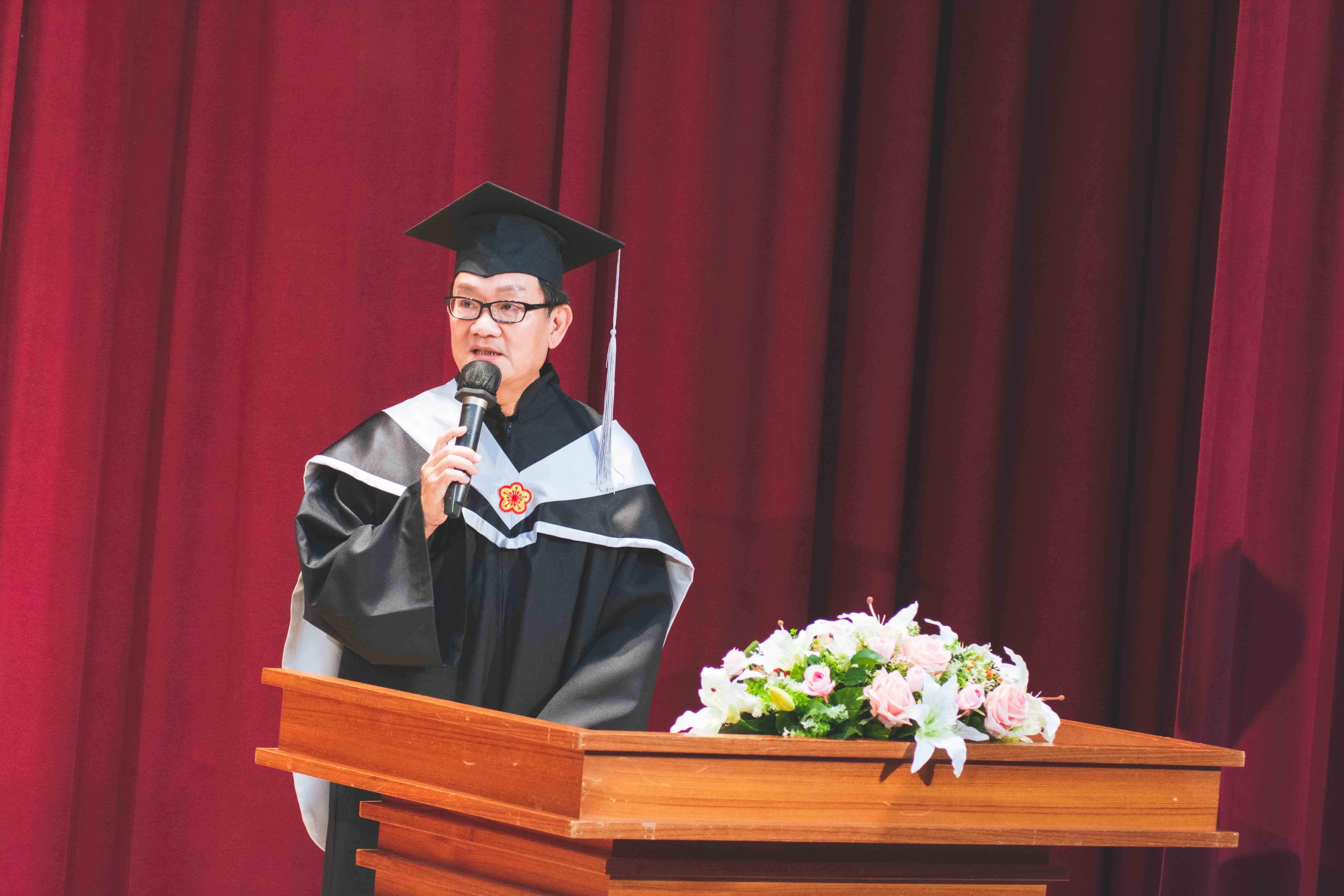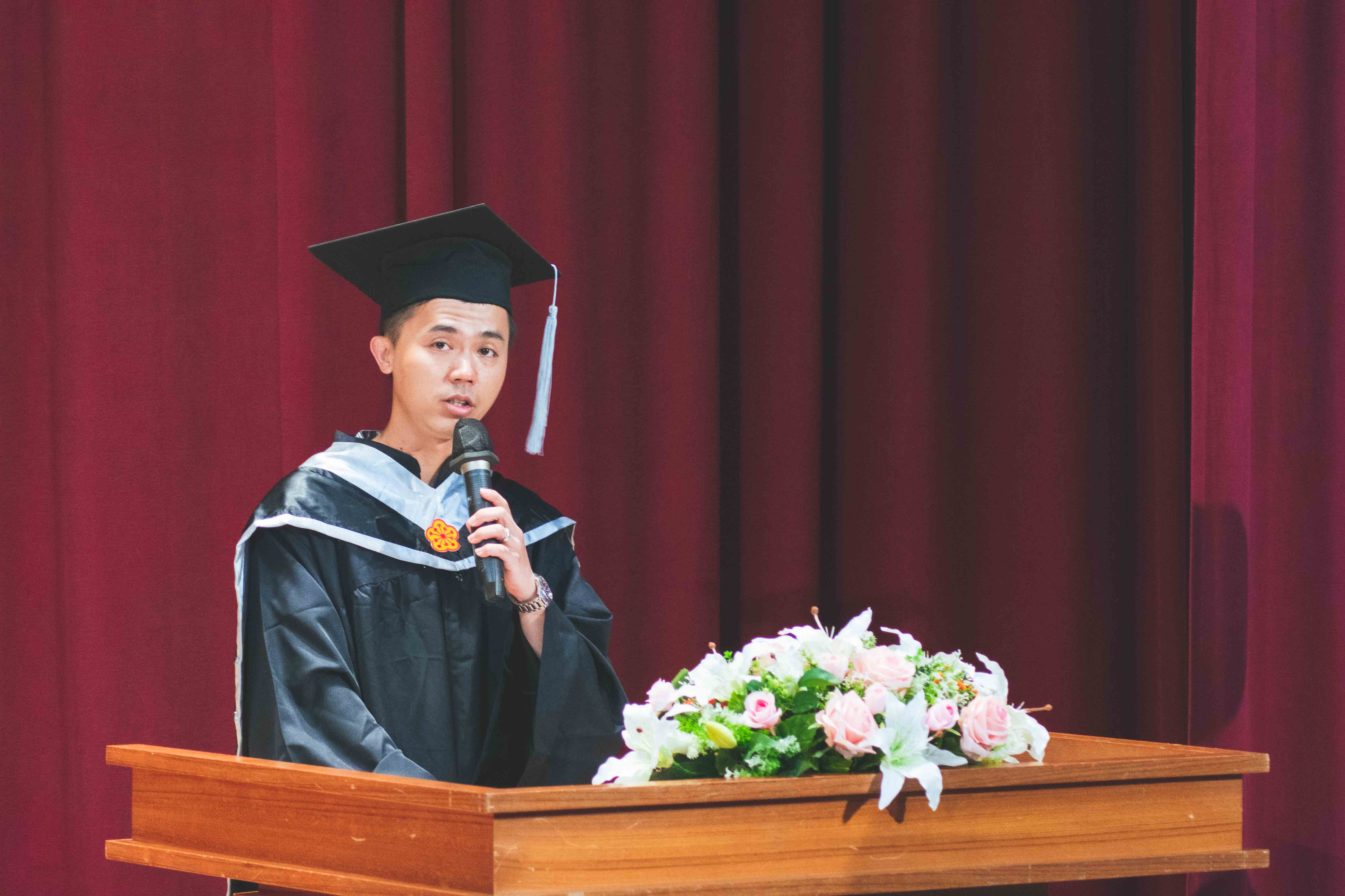 第三位是MEMBA指參班畢業生代表-林耀庭,他除了感謝所有幫助過他們、支持他們的人,也感謝指導教授林俊佑老師以及未婚妻的支持與鼓勵,讓他在兼顧保家衛國的同時仍順利完成學業。林同學回憶這段學習過程中,培養出尋找問題的細膩、面對問題的勇氣及解決問題的能力,而這些收穫將伴隨一生受用,最後期許畢業生們能夠保持謙遜的心繼續學習,堅定地走下去。第四位是MEMBA大直班畢業生代表-陳鍵誼,因軍職的特殊性常會因工作性質而中斷學習,剛好遇上疫情期間,遠距教學讓學習變得便利很多,身為軍人,不只要完成本身的職責,還要帶領團隊完成演訓,更要24小時待命,能夠順利完成學業不是一件易事,他也提到國軍同仁們退伍的年紀剛好是企業中高階主管的年紀,同時行銷國軍本身,希望在場非軍職體系的大家能夠多多延攬國軍弟兄,最後感謝師長傳道、授業、解惑並祝福畢業生鵬程萬里。