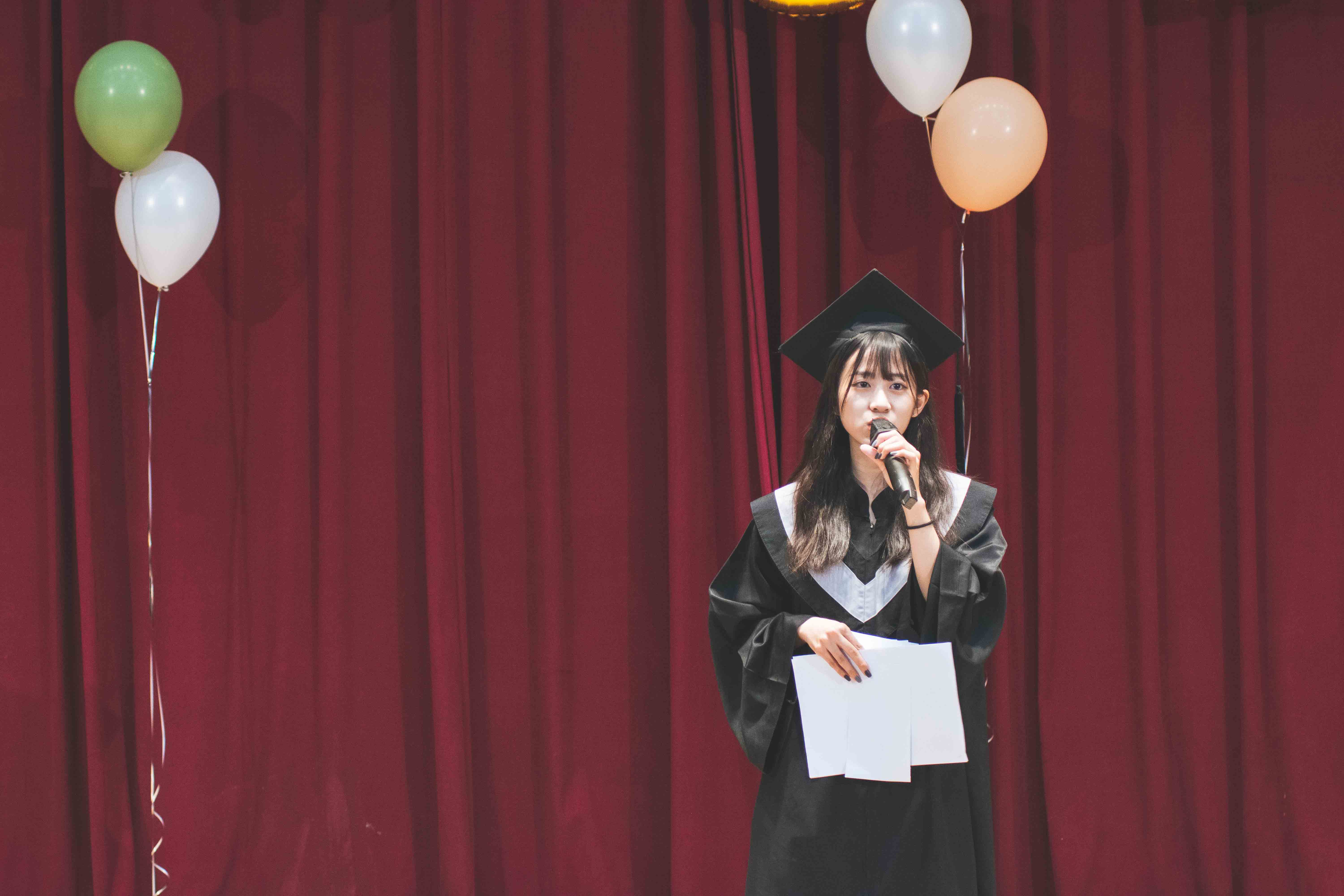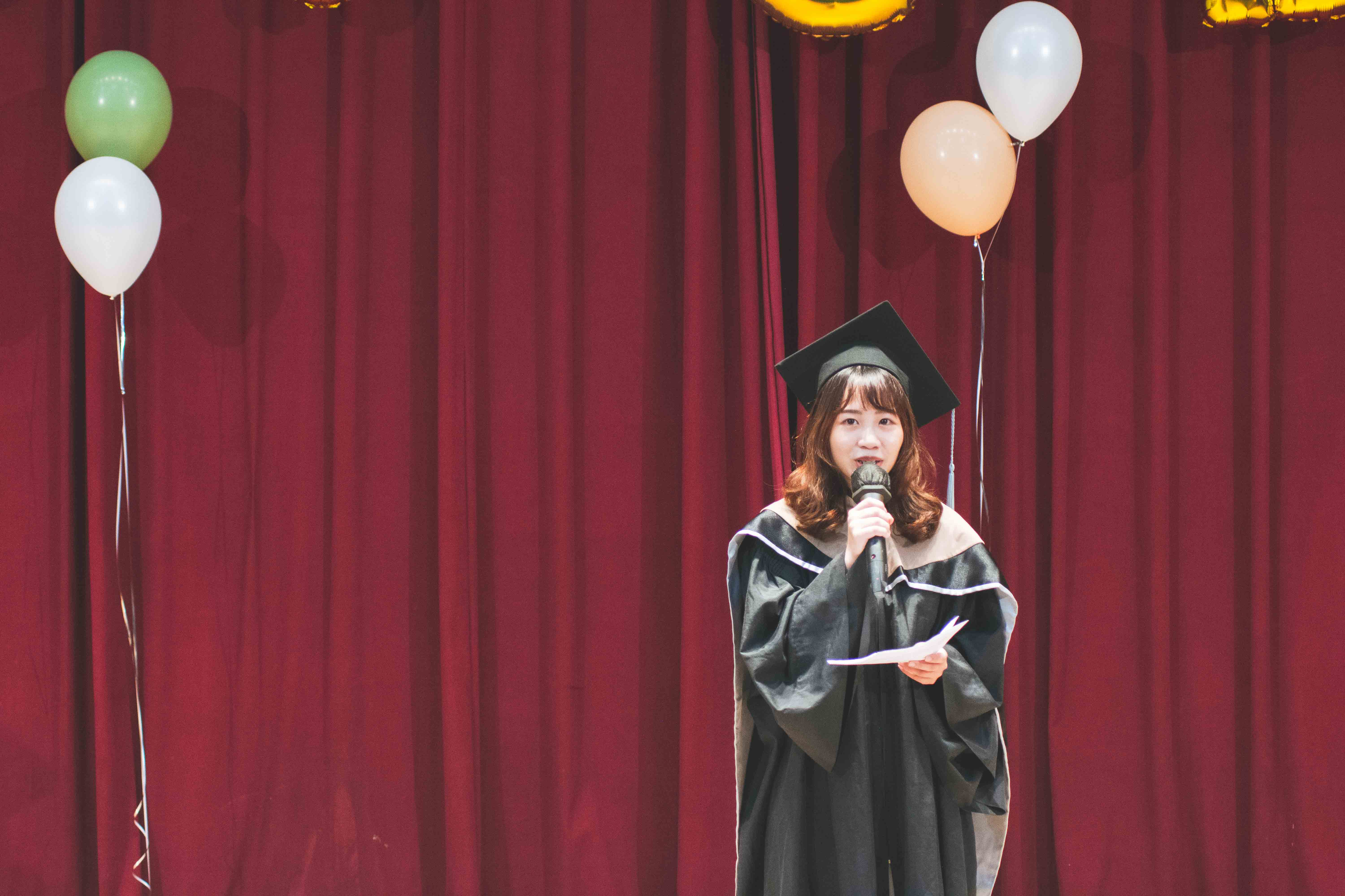 第七位是學士班畢業生代表-王心妤,她一一唱名感謝班上同學,回憶課堂上面臨的困難與挑戰,北大周圍店家更迭與物價飛漲,訴說著啦啦隊比賽、舉辦宿營等活動之甘苦。隨著時間過去,大家和四年前相比也變得成熟穩重許多,現在每個人都有了不同的目標,想對在座的各位說聲「辛苦了!」一路走來要感謝的人很多,感謝師長、家人、朋友,更要感謝自己,最後也祝願大家能成為自己喜歡的樣子,不畏風雨、保持善良。最後則是由進修學士班畢業生代表-孫櫻倫上台致詞,孫同學感謝師長不厭其煩地諄諄教誨,期許大家能夠幫助他人且隨時保持感恩的心,感謝張惠真老師、劉仲矩老師、詹佳縈老師、魏嘉宏老師、蕭宇翔老師等人的教導與歡笑,最後也感謝上帝,祝福大家。