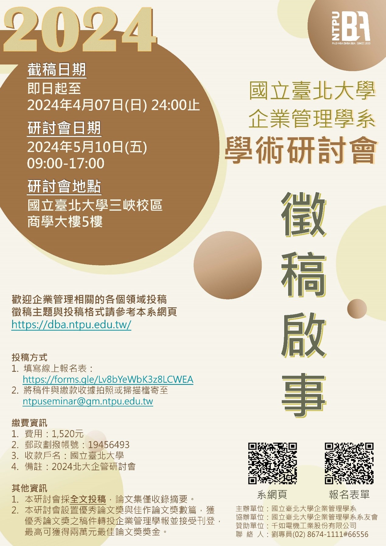 國立臺北大學企業管理學系將於2024年5月10日(五)假本校三峽校區舉辦「2024國立臺北大學企業管理學系學術研討會」,竭誠歡迎管理學術界與實務界各位先進共襄盛舉。本次研討會徵稿主題如下: