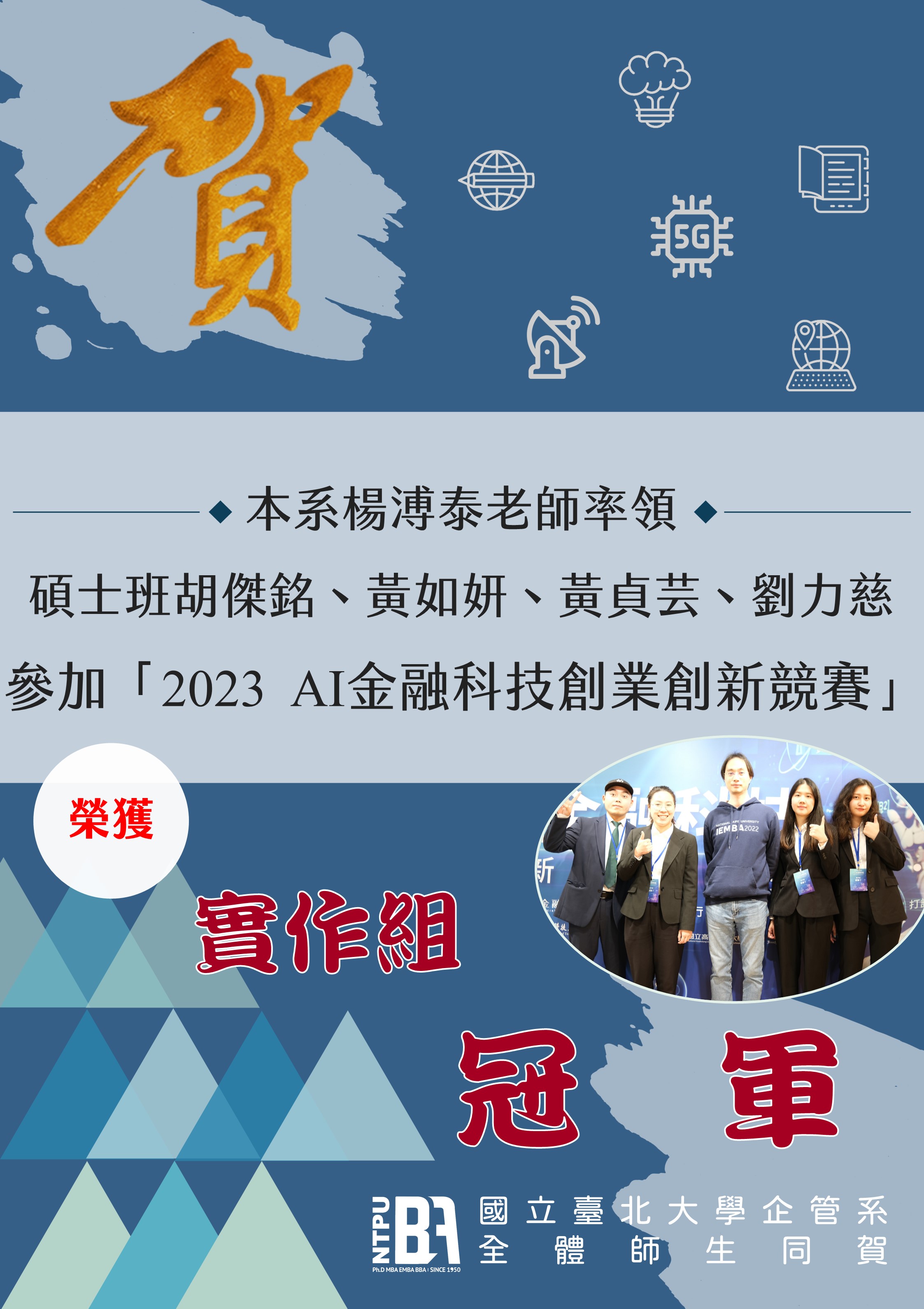 賀!本系楊溥泰老師率領碩士班學生參加「2023 AI金融科技創業創新競賽」榮獲實作組冠軍