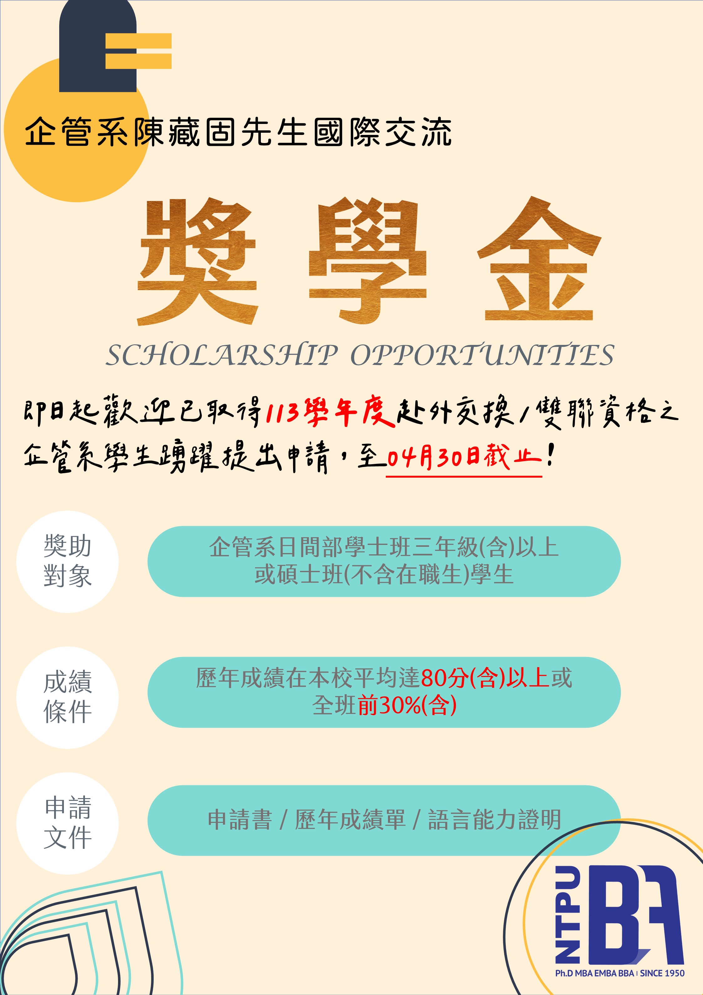 113-1 陳藏固先生國際交流獎學金開始申請囉!