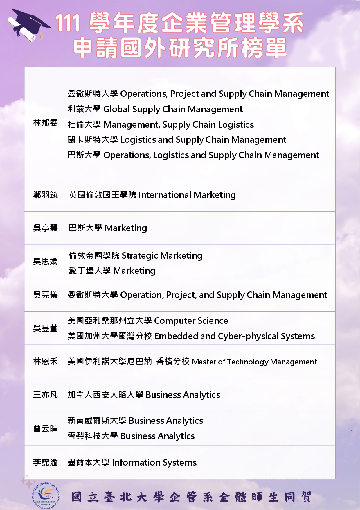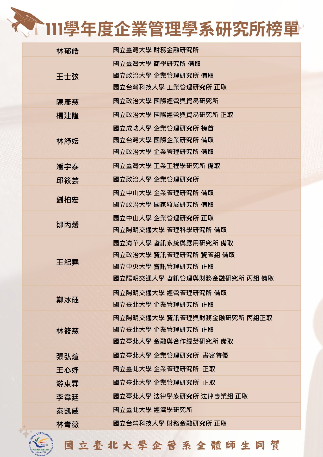 111學年度企管系研究所榜單及申請國外研究所榜單