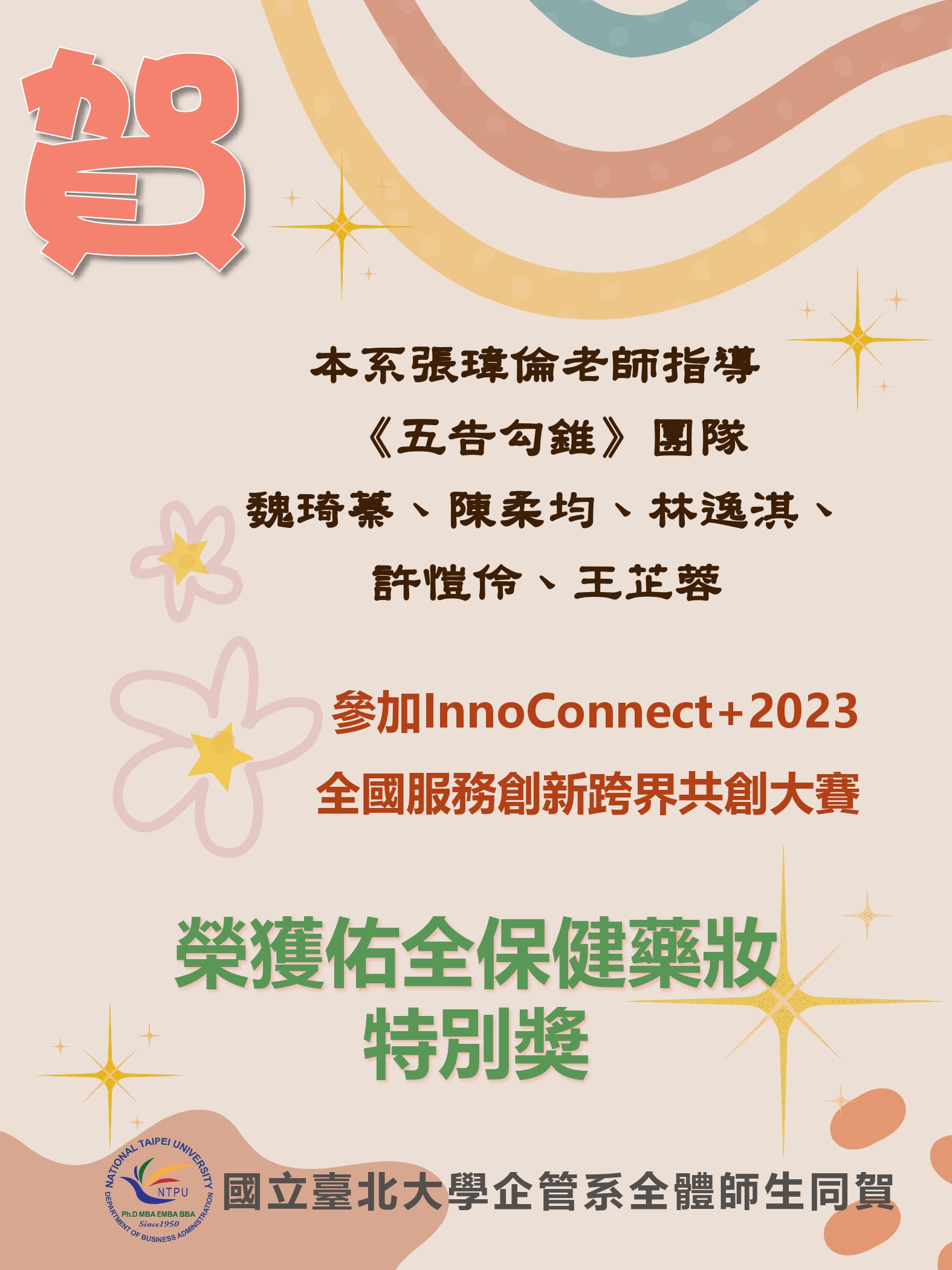 賀!企管系張瑋倫老師指導企管系學生參加InnoConnect+2023全國服務創新跨界共創大賽,榮獲佑全保健藥妝特別獎