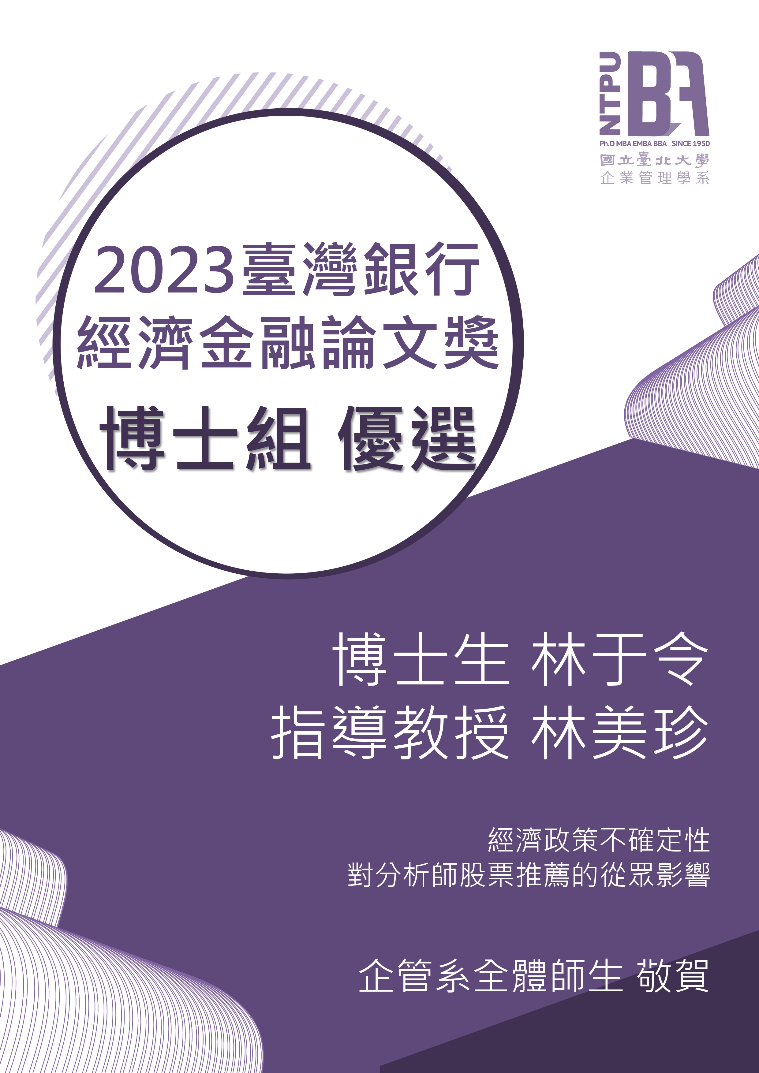 賀!本系博士生林于令 榮獲2023臺灣銀行經濟金融論文獎博士組優選