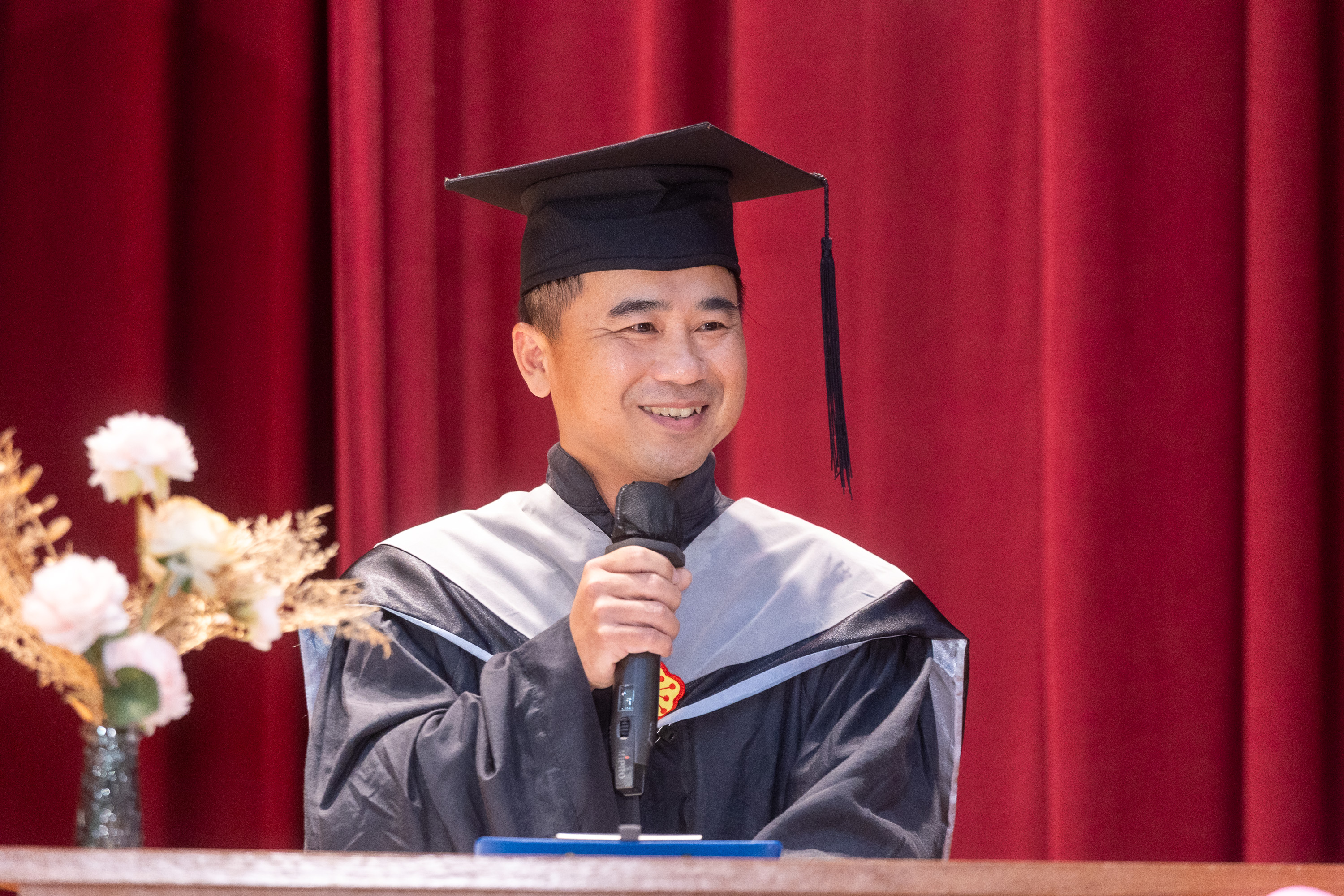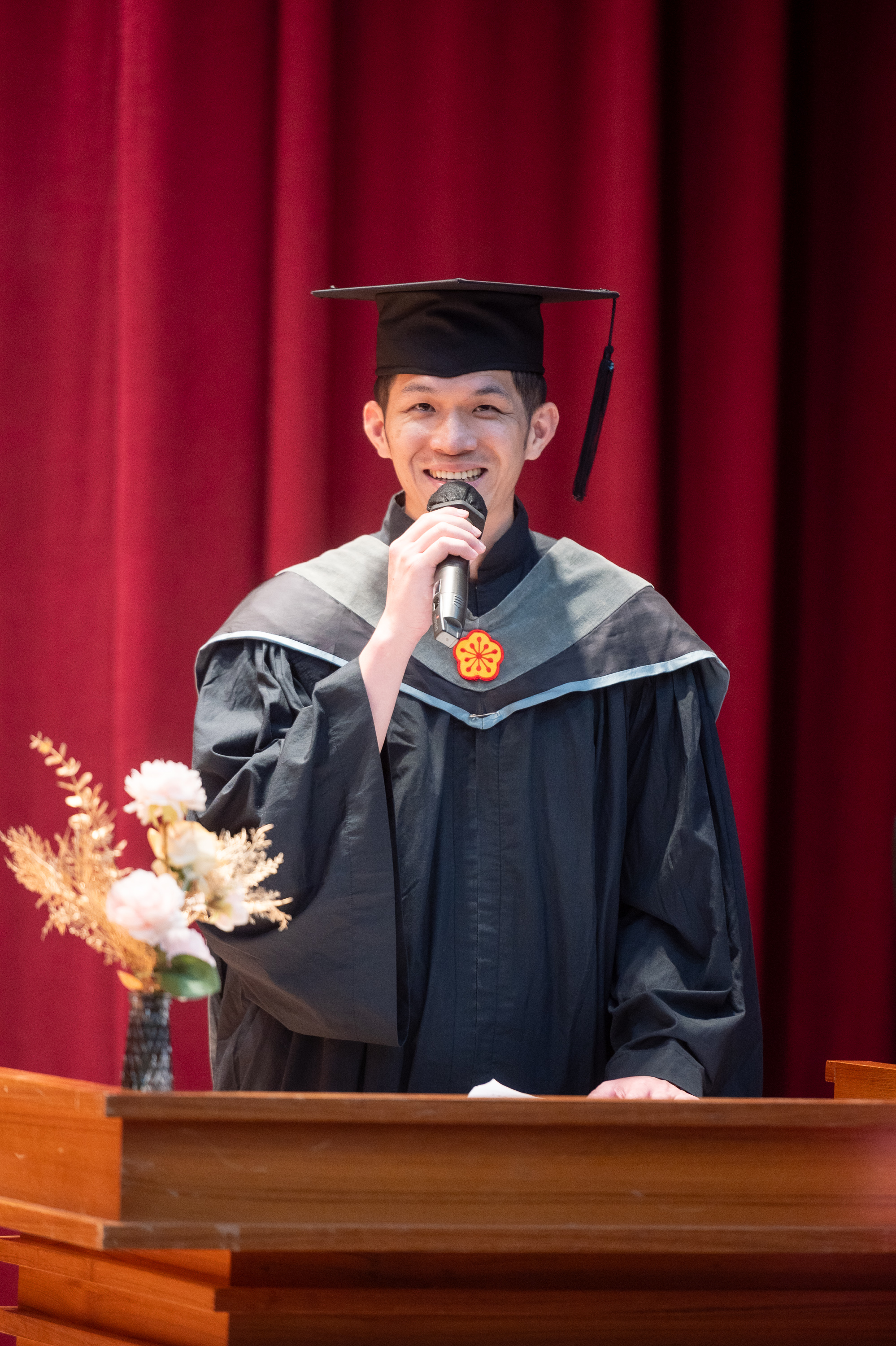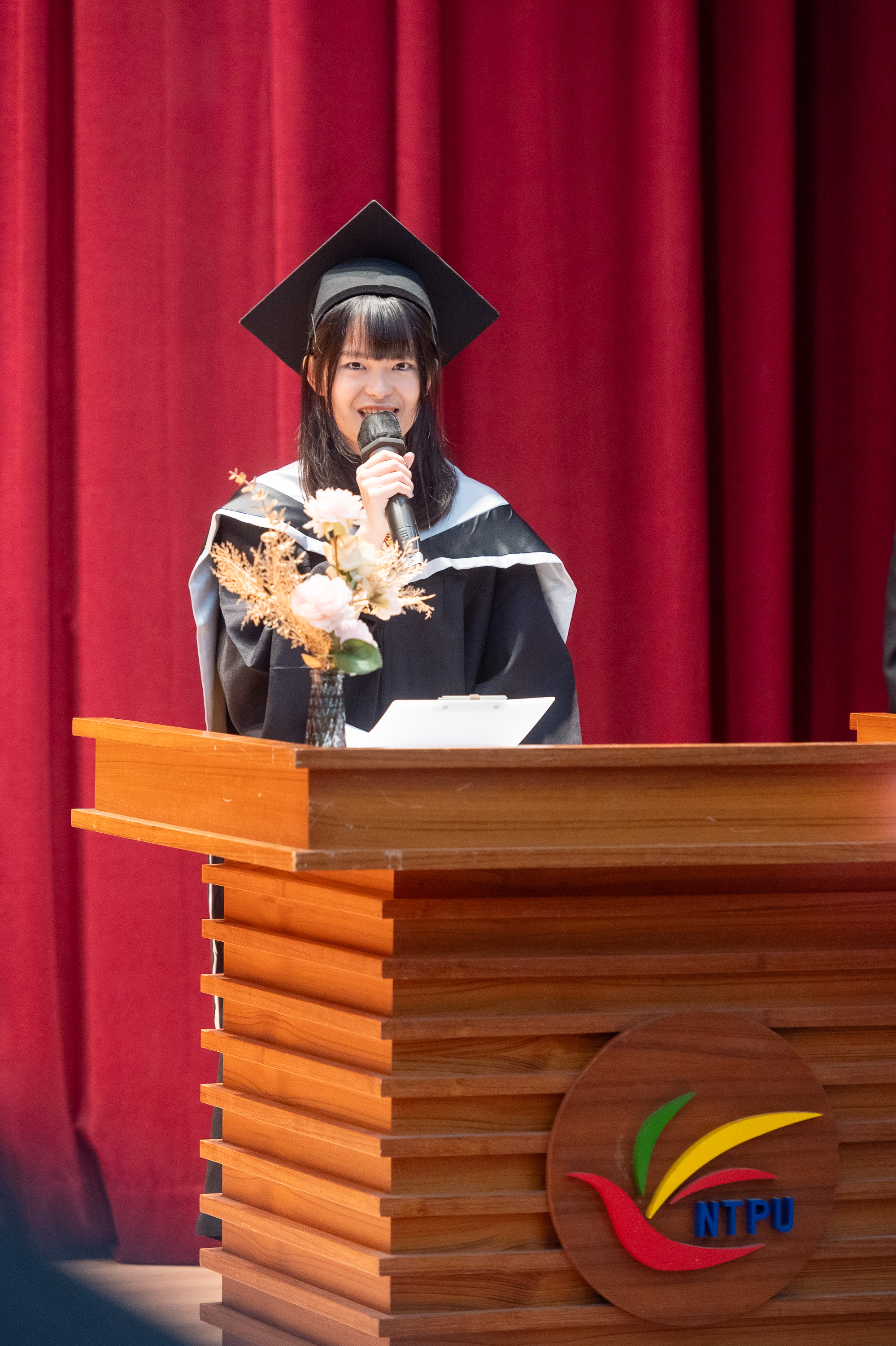 接著是碩士班畢業生代表-鄭景中,他一一感謝老師的指導及培育,於在職進修的過程中,學到許多實用的知識,讓他能夠應用在未來的職涯發展。碩士班畢業生代表-林品妤回顧了在校期間的學習和生活經歷,除了感謝同學和老師的支持外,表示這段經歷將成為她一生寶貴的回憶。緊接著闕將宇代表學士班畢業生致詞,他感謝教授和家人的支持,讓他能順利完成學業,回憶起大學期間的點點滴滴,這段經歷讓他成長許多,對未來充滿期待。最後則是由進修學士班畢業生代表-簡佑錚上台致詞,簡同學很感謝學校提供的學習機會,在經歷職場洗禮後還能持續進修,並在進修過程中發現自己的不足,開啟自己跨領域學習之路。
