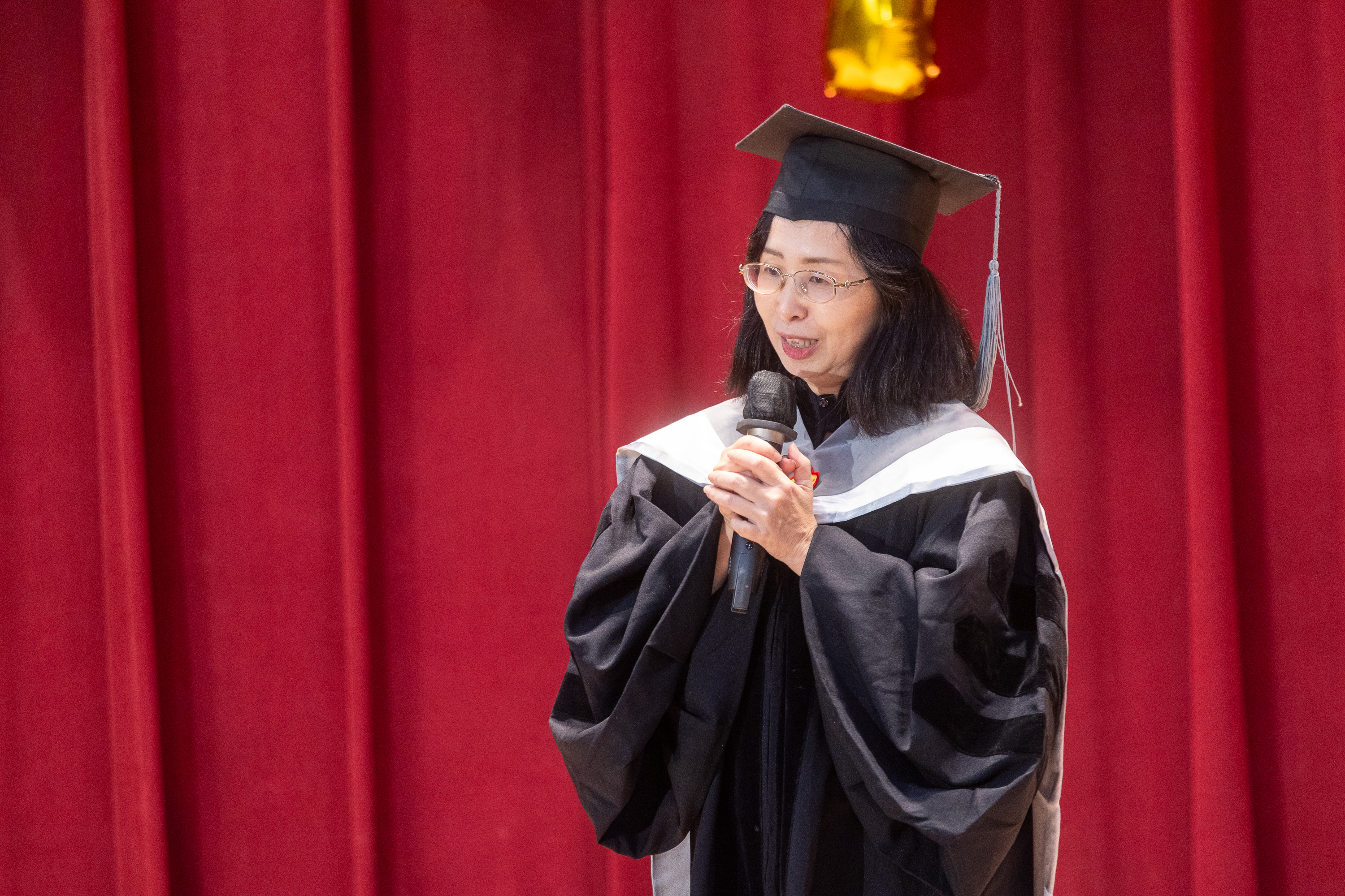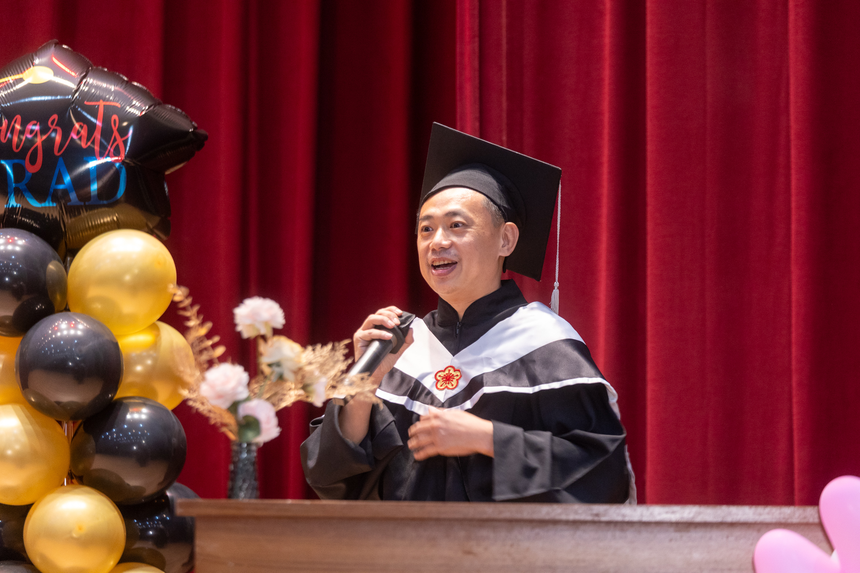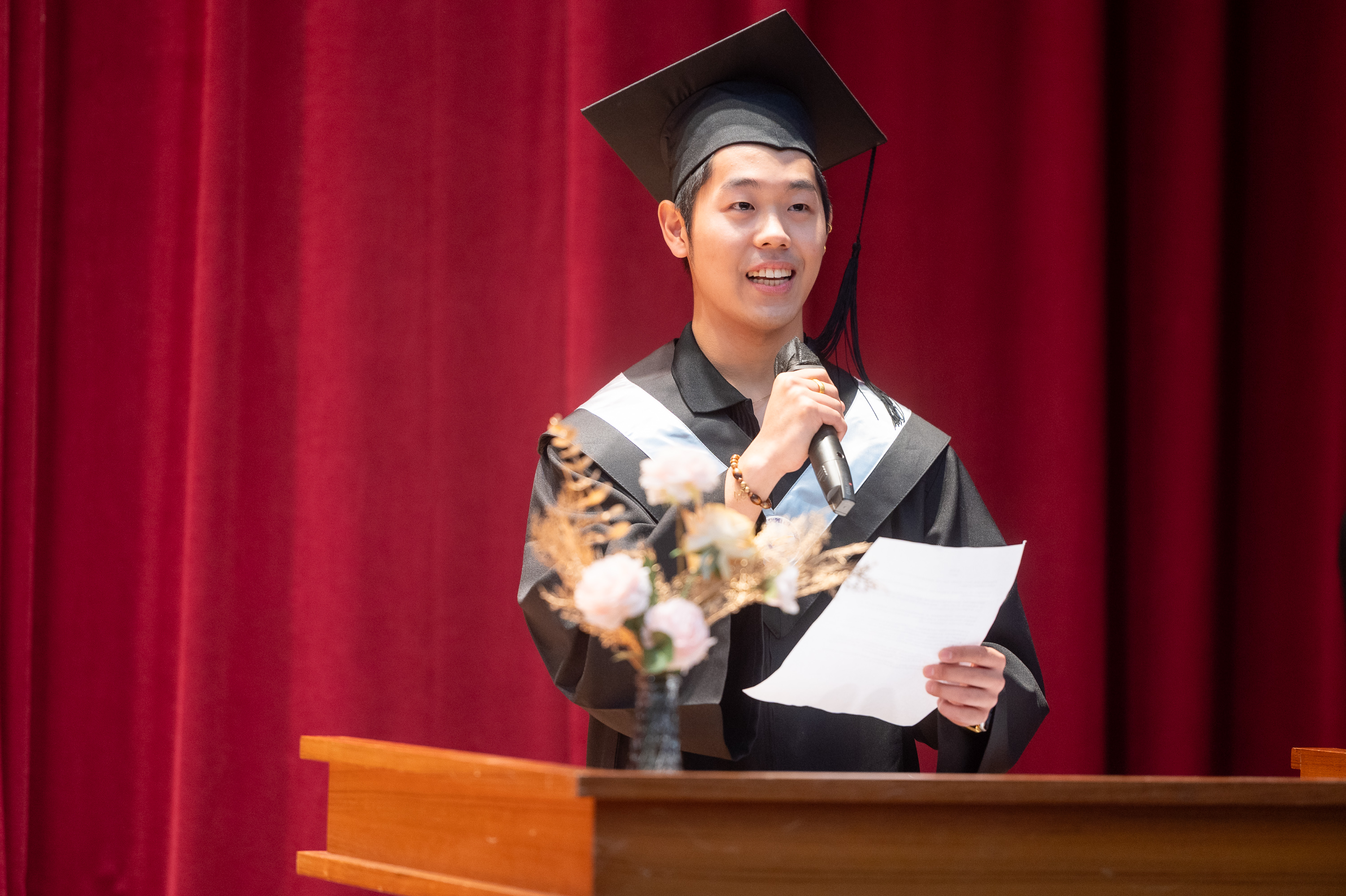 接著是碩士班畢業生代表-鄭景中,他一一感謝老師的指導及培育,於在職進修的過程中,學到許多實用的知識,讓他能夠應用在未來的職涯發展。碩士班畢業生代表-林品妤回顧了在校期間的學習和生活經歷,除了感謝同學和老師的支持外,表示這段經歷將成為她一生寶貴的回憶。緊接著闕將宇代表學士班畢業生致詞,他感謝教授和家人的支持,讓他能順利完成學業,回憶起大學期間的點點滴滴,這段經歷讓他成長許多,對未來充滿期待。最後則是由進修學士班畢業生代表-簡佑錚上台致詞,簡同學很感謝學校提供的學習機會,在經歷職場洗禮後還能持續進修,並在進修過程中發現自己的不足,開啟自己跨領域學習之路。