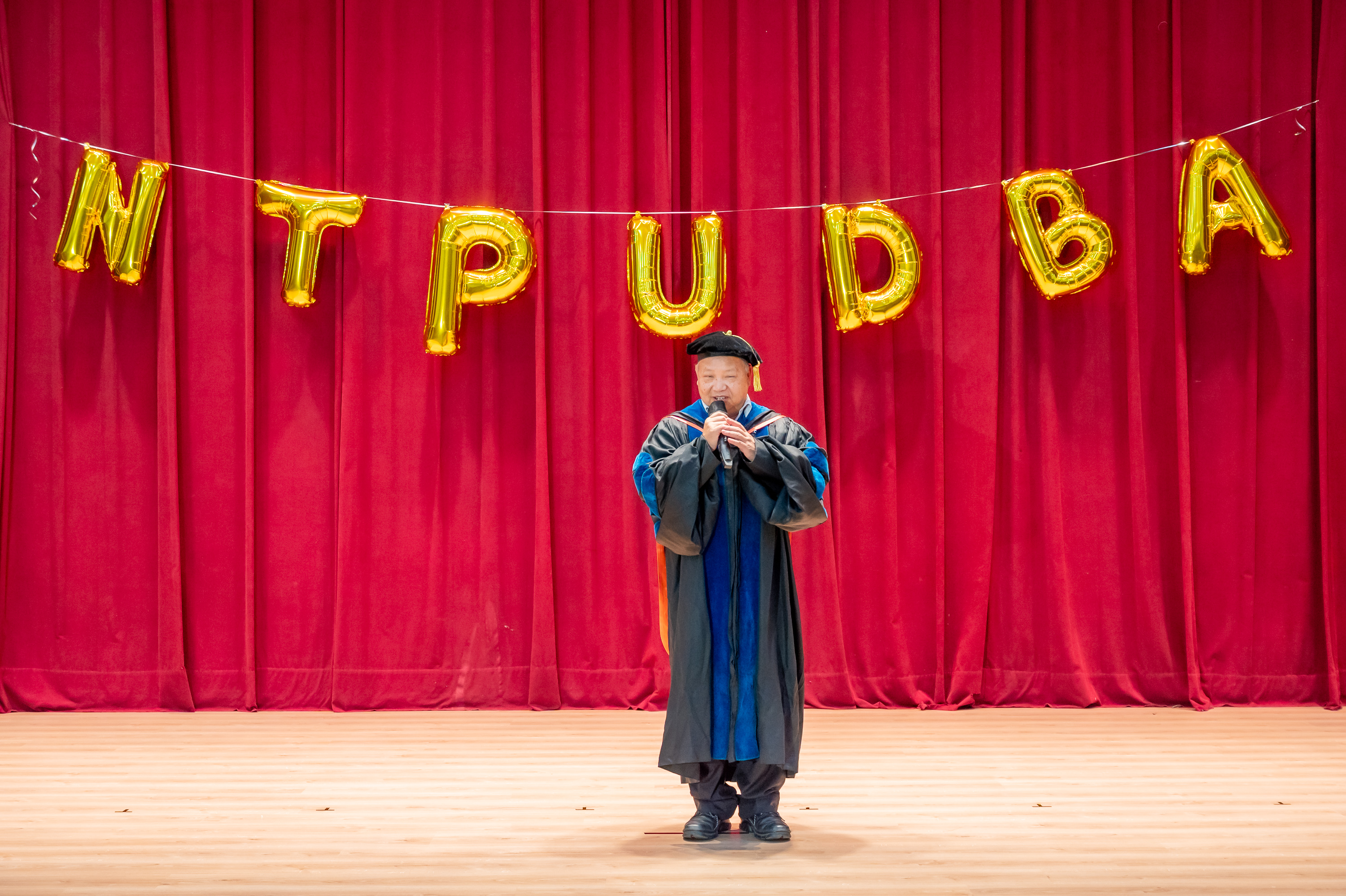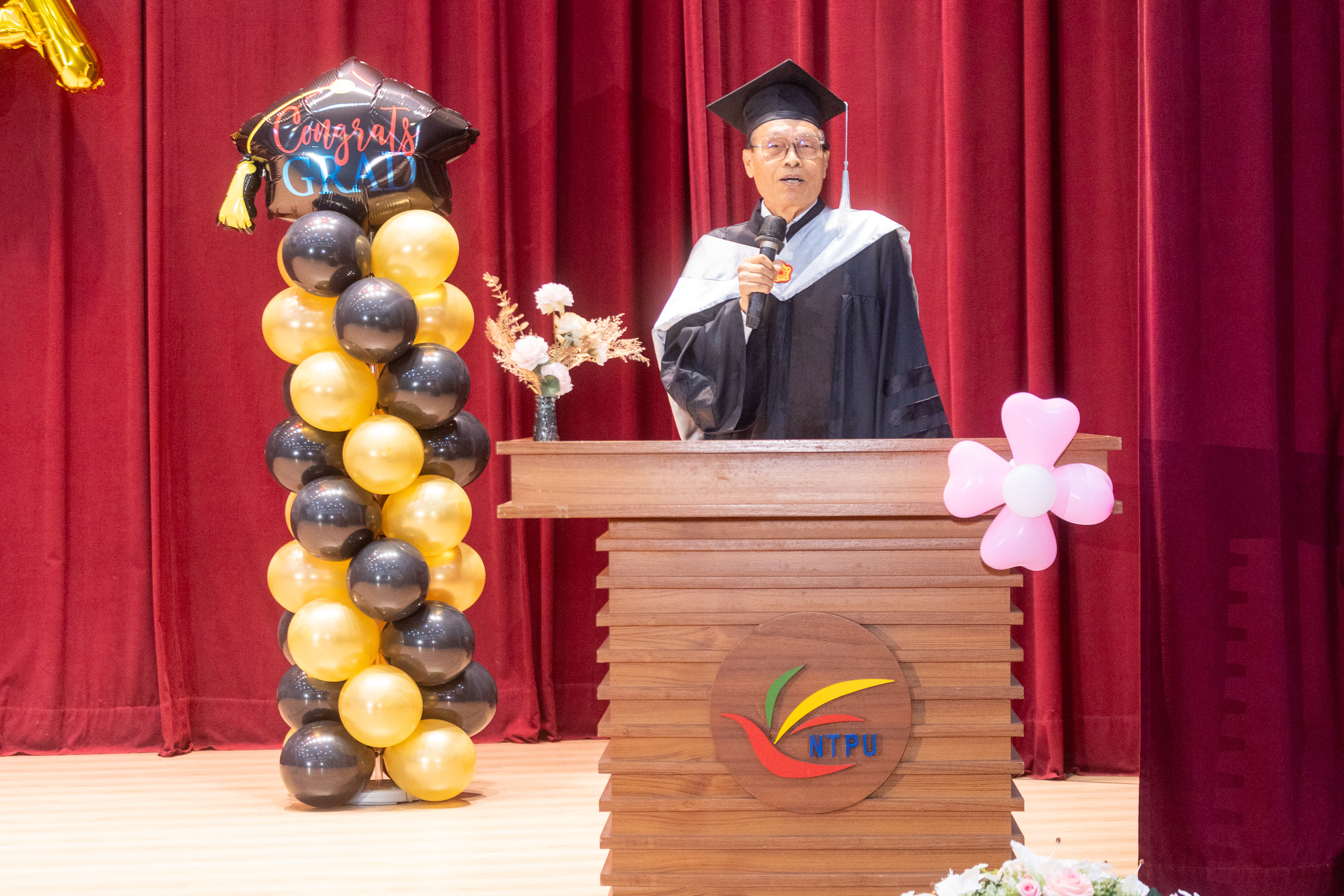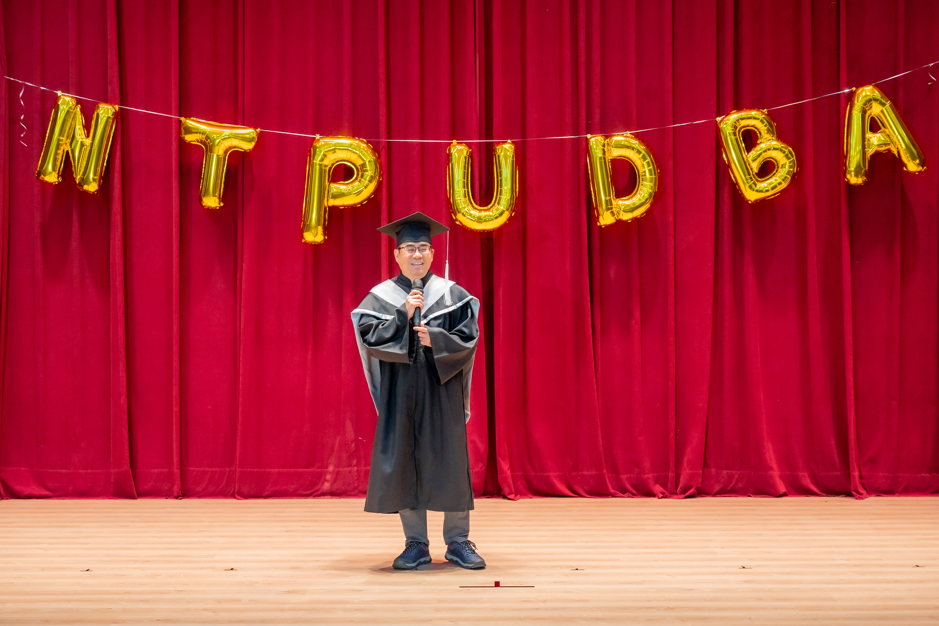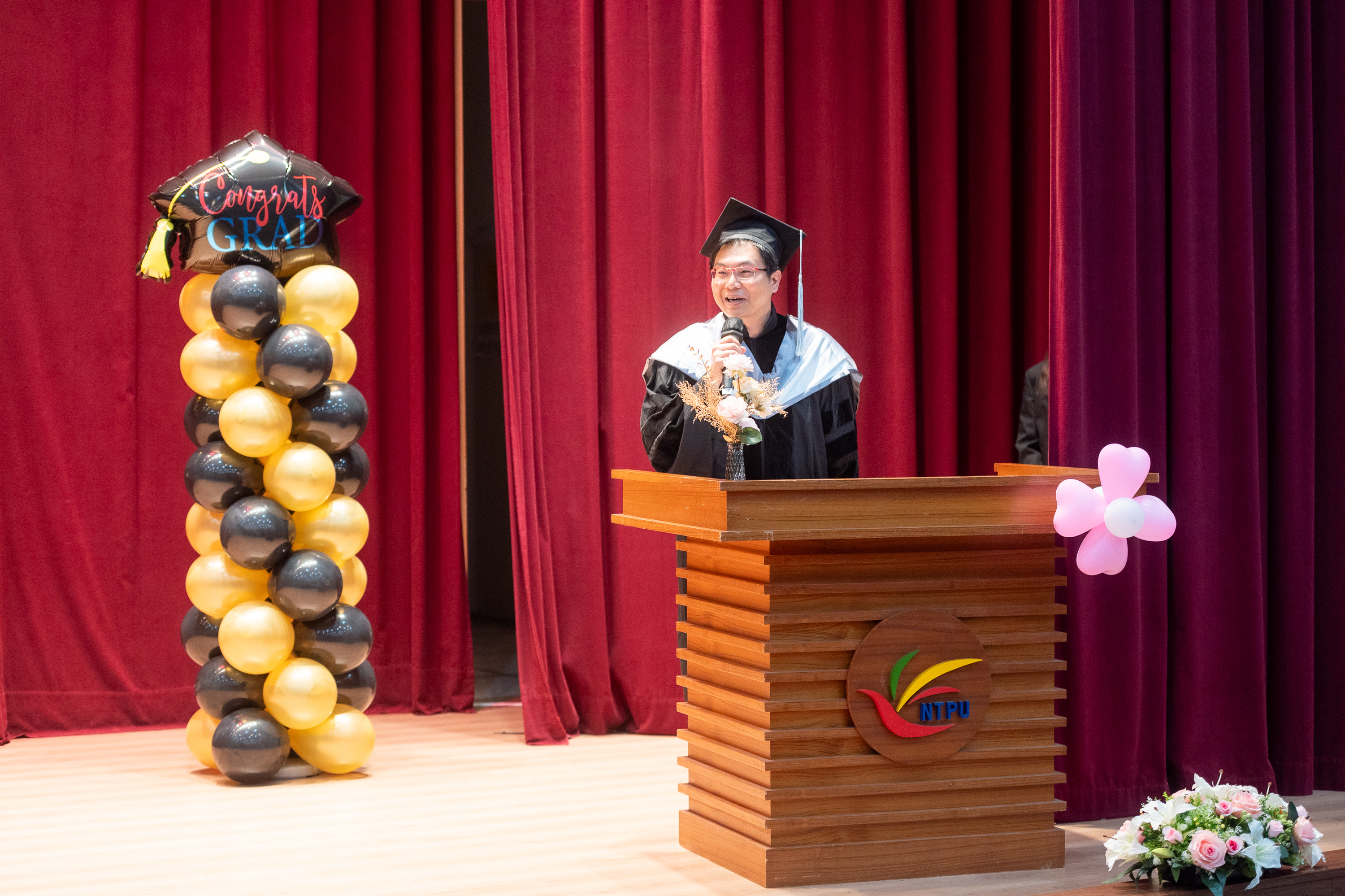 首先是博士班畢業生代表-黃建喬,他感謝教授們的教導和支持,特別提到同學間的互相激勵和共同克服困難的友誼,並感謝家人的支持,同時分享自己在博士班的領悟「當我們在感到內心糾結不舒服的時候,就是我們成長的開始」,期許大家在未來的道路上能夠不斷地前行,創造更多的奇蹟。第二位是EMBA畢業生代表-黃正田,他特別感謝學校提供的優質學習環境,使同學們在學習過程中充滿活力,發揮「北大人,一家人」的精神,用愛的鼓勵炒熱氣氛,並感謝企管系老師們的指導與同學們的陪伴。MEMBA畢業生代表-劉庭瑋和林仲宏,在致詞中分享軍職班的學習經歷,深深感謝師長的指導和同袍們的支持,表示雖然寫論文對於軍職班學生是一項挑戰,但這段學習經歷讓他們心智更加堅強,也讓他們對未來充滿信心,最後期許畢業生們事業成功,在臺北大學的肩膀上看見世界的遙遠。