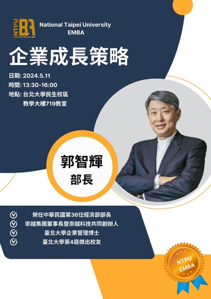 臺北大學EMBA隆重邀請到即將就任的第三十六屆經濟部長郭智輝博士回到母系演講,分享企業多角化經營策略,這也是自4月16日宣布內閣名單以來,郭智輝學長首次回歸母校的活動,令師長與學弟妹們都感到相當喜悅與榮幸!郭學長是本系EMBA第一屆大學長,面對台下聽講的EMBA24、25屆的學弟妹,驚呼著「時間真的過得好快!」