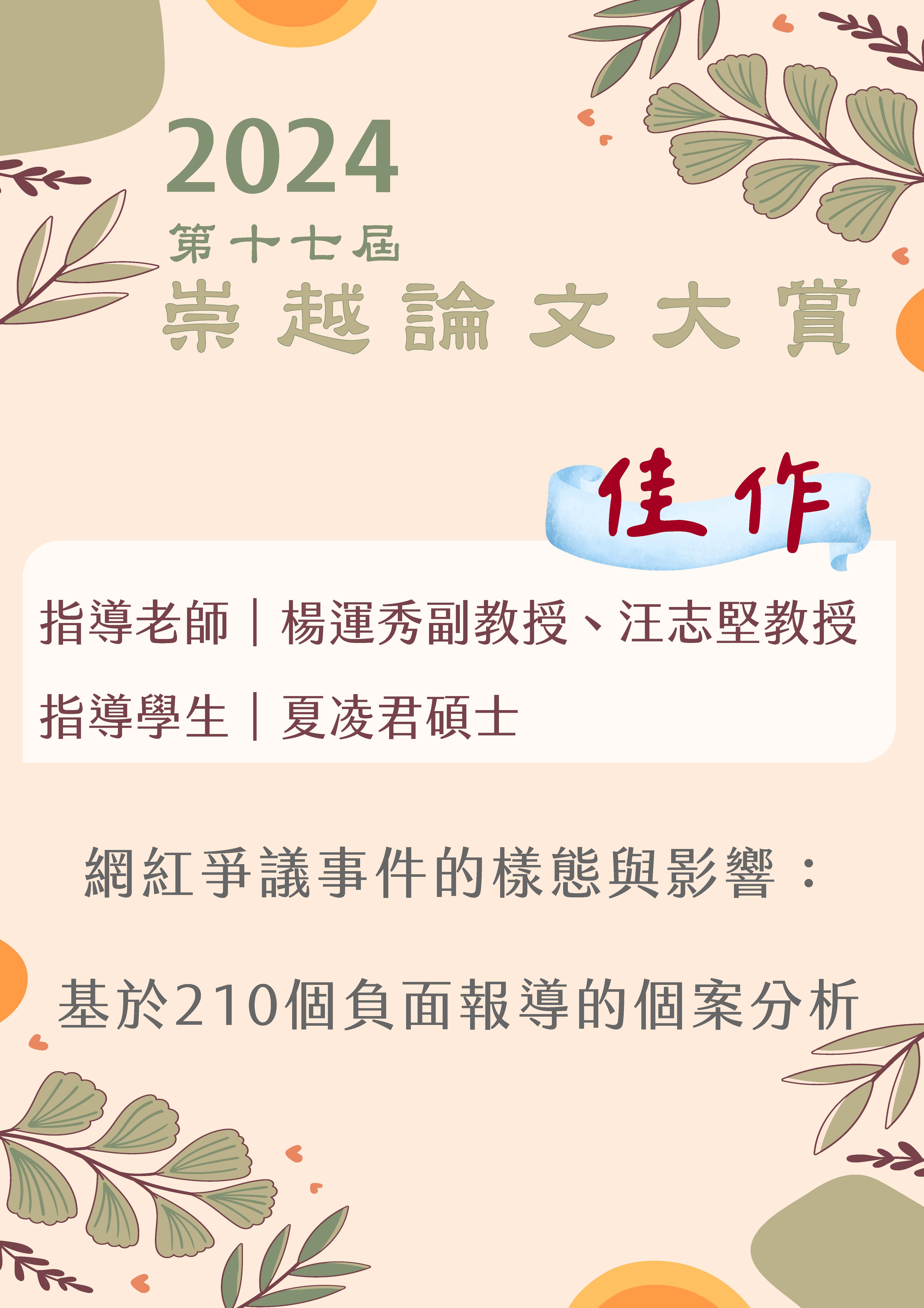 賀!111級夏凌君碩士生 榮獲《2024 第十七屆 崇越論文大賞》佳作