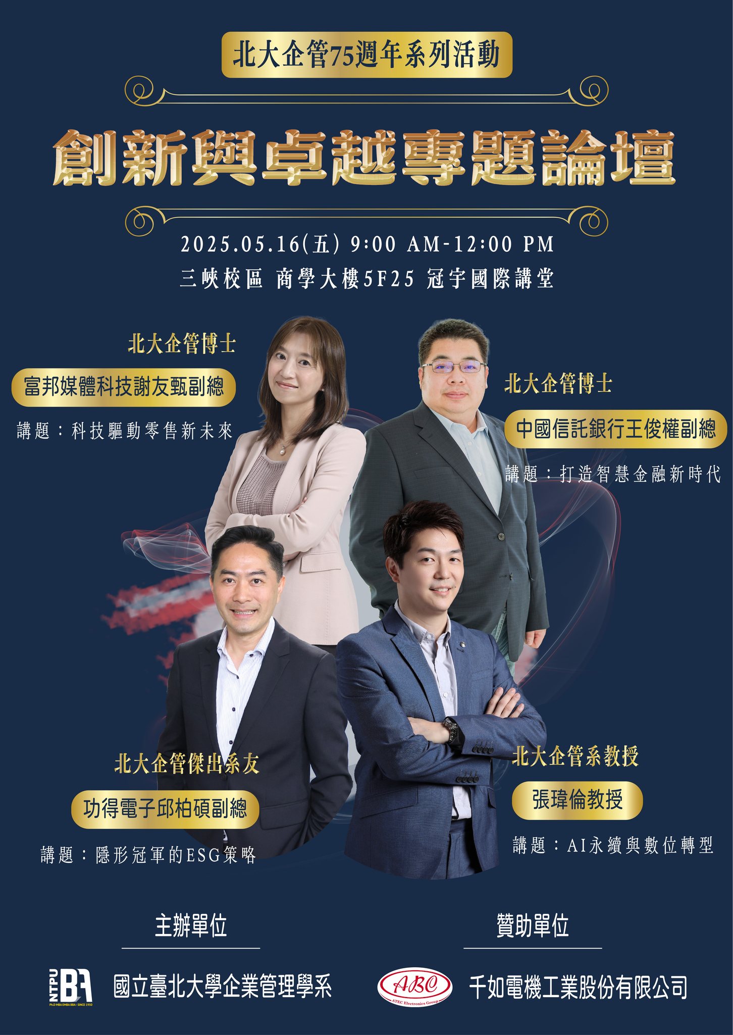 今年適逢臺北大學企業管理學系75週年,我們誠摯邀請您參加 「創新與卓越專題論壇」,一同共襄盛舉!