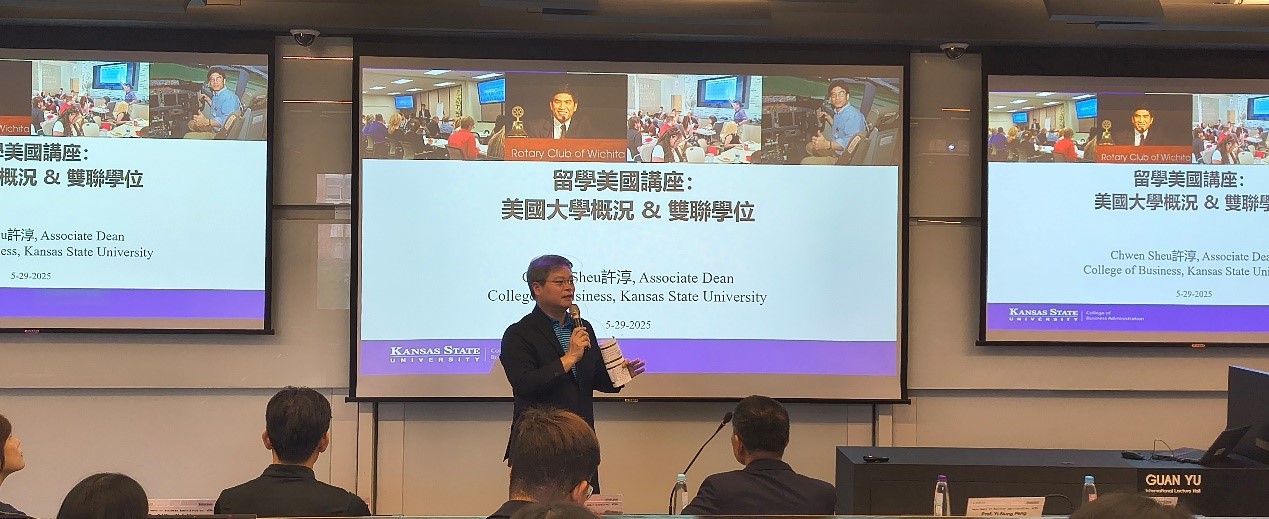 2025年5月29日,美國堪薩斯州立大學(Kansas State University, KSU)管理學院副院長許淳(Chwen Sheu)教授來訪,並親自主持一場關於碩士雙聯學位的專題講座。身為學術與行政要職兼具的國際學者,許副院長在百忙之中親自蒞臨並與學生面對面交流,這樣的機會可說是極為難得,格外珍貴。從他開口的第一句話開始,便吸引了在場每一位學生的目光。這不只是一場資訊分享,更像是一場讓人重新思考未來可能性的旅程。
