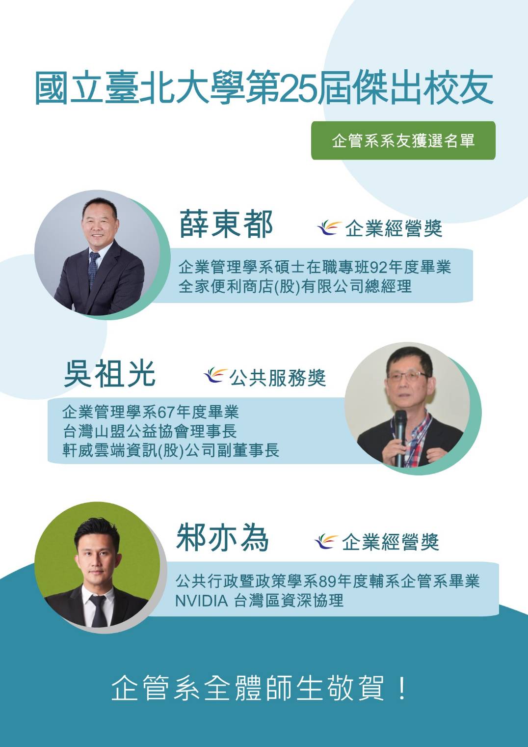 【賀】薛東都學長、吳祖光學長與邾亦為學長當選國立臺北大學第25屆傑出校友