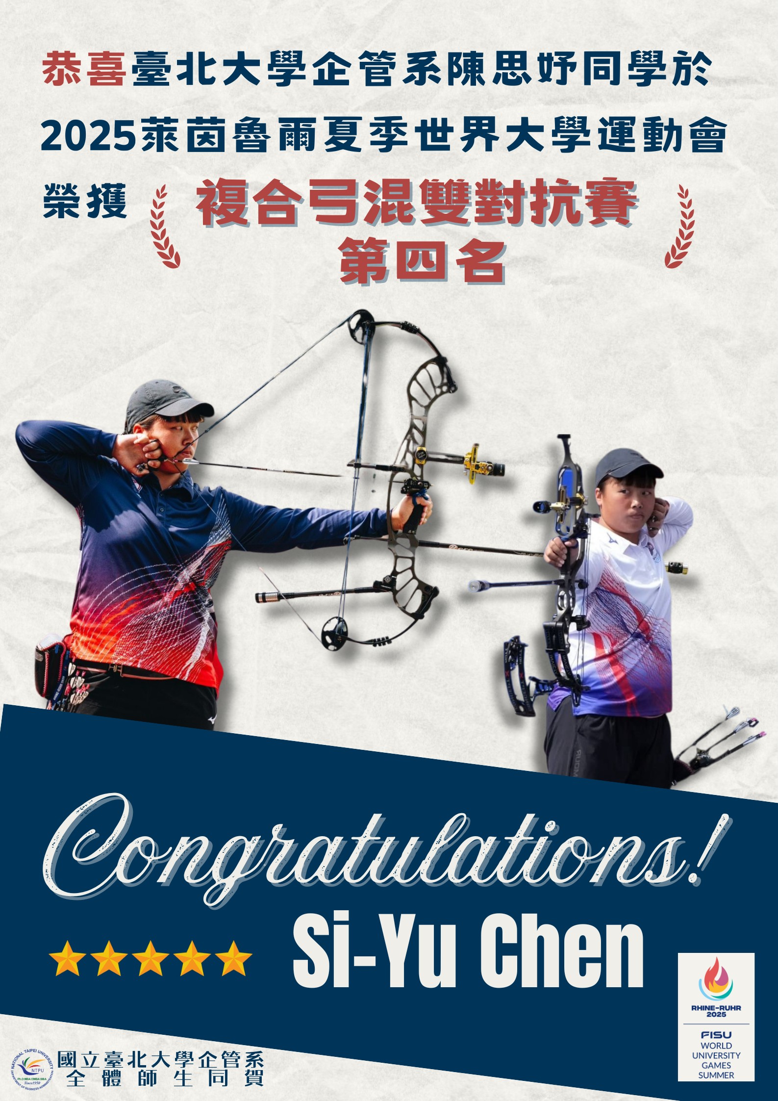 【賀】本系陳思妤學生參加《2025萊茵魯爾夏季世界大學運動會》榮獲射劍複合弓混雙對抗賽第四名