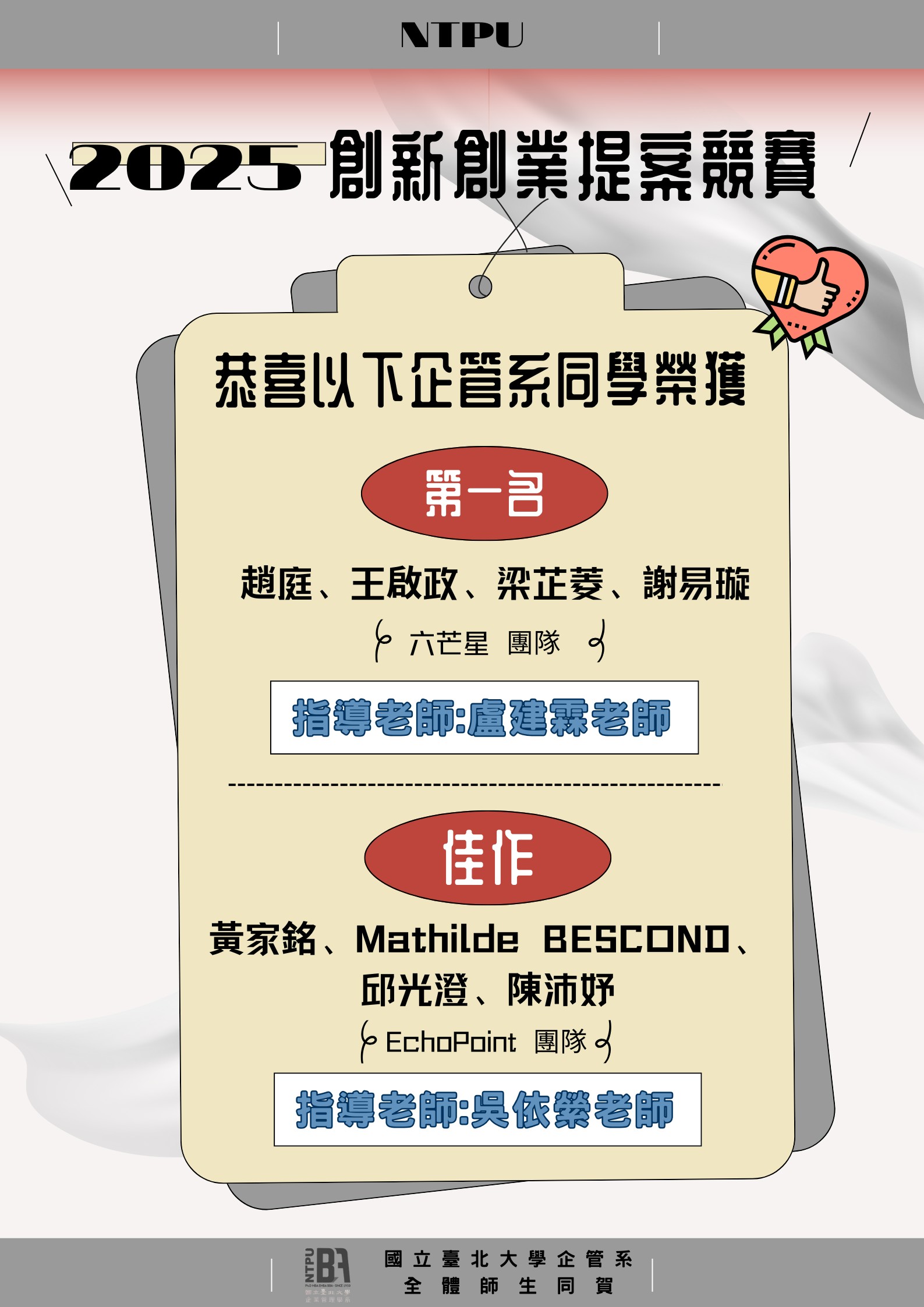 【賀】盧建霖老師與吳依縈老師率領學生參加《2025創新創業提案競賽》榮獲第一名與佳作