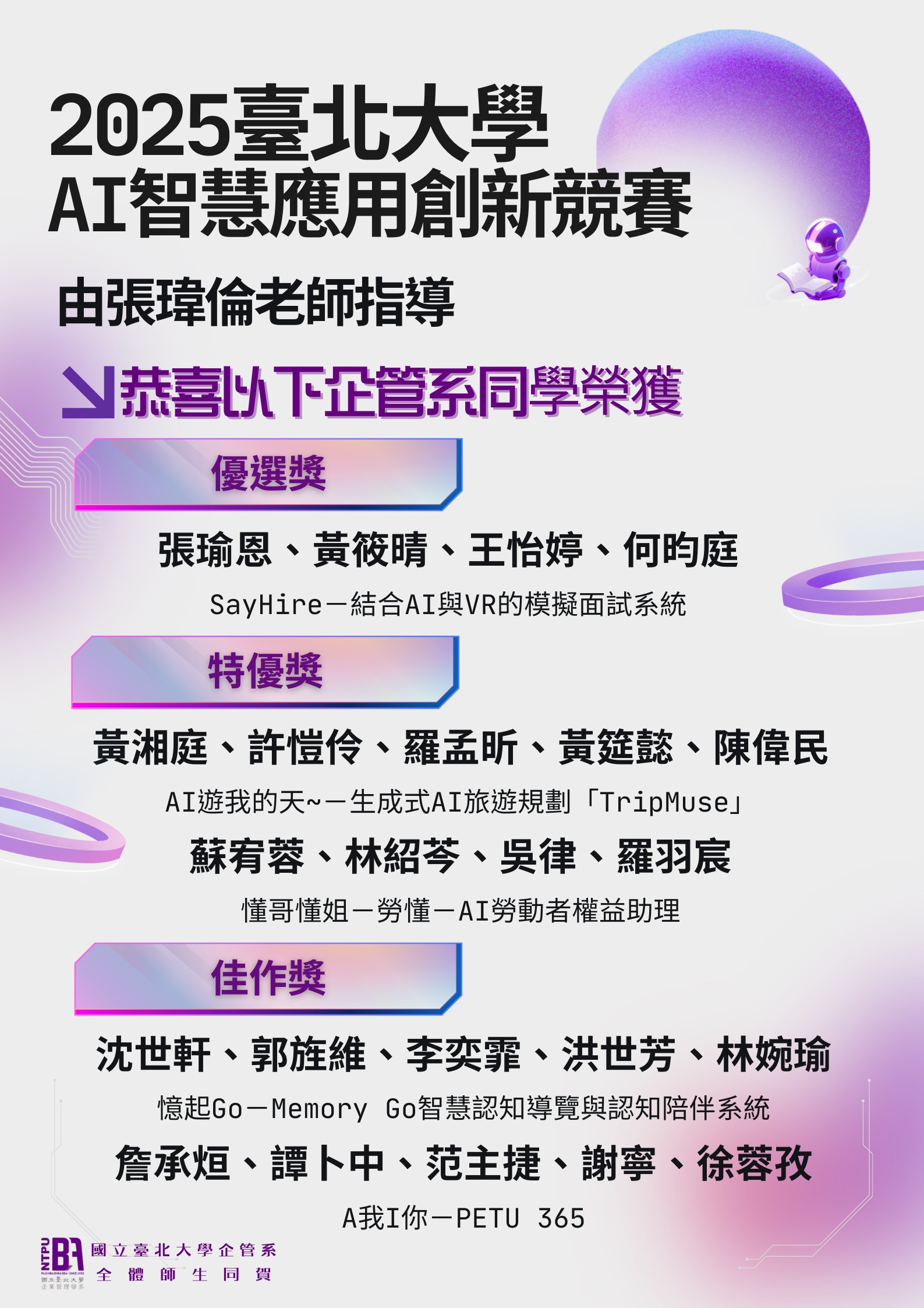 【賀】張瑋倫老師率領學生參加《2025臺北大學AI智慧應用創新競賽》榮獲佳績