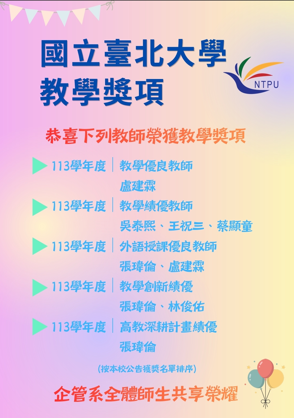 【賀】113學年度企管系盧建霖老師榮獲教學優良教師,吳泰熙老師、王祝三老師、蔡顯童老師榮獲教學績優教師,張瑋倫老師、盧建霖老師榮獲外語授課優良教師,張瑋倫老師、林俊佑老師榮獲教學創新績優,張瑋倫老師榮獲高教深耕計畫績優