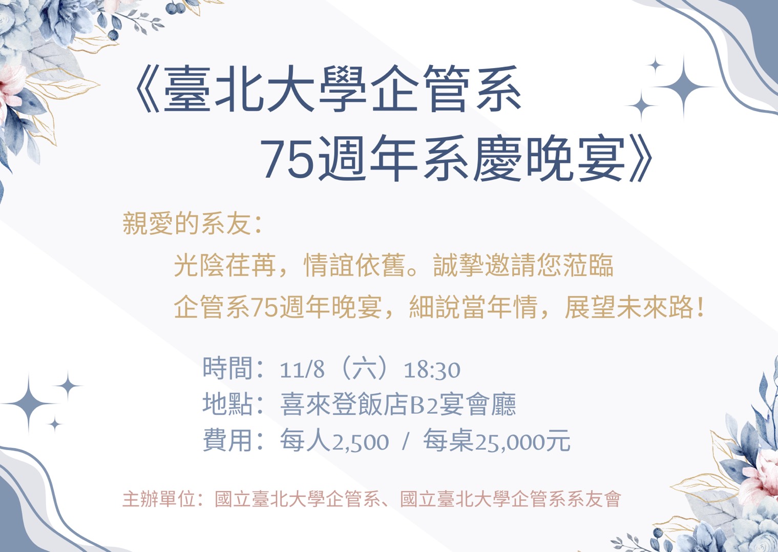 Aug 13 臺北大學企管系75週年系慶晚宴(9月1日開放報名)