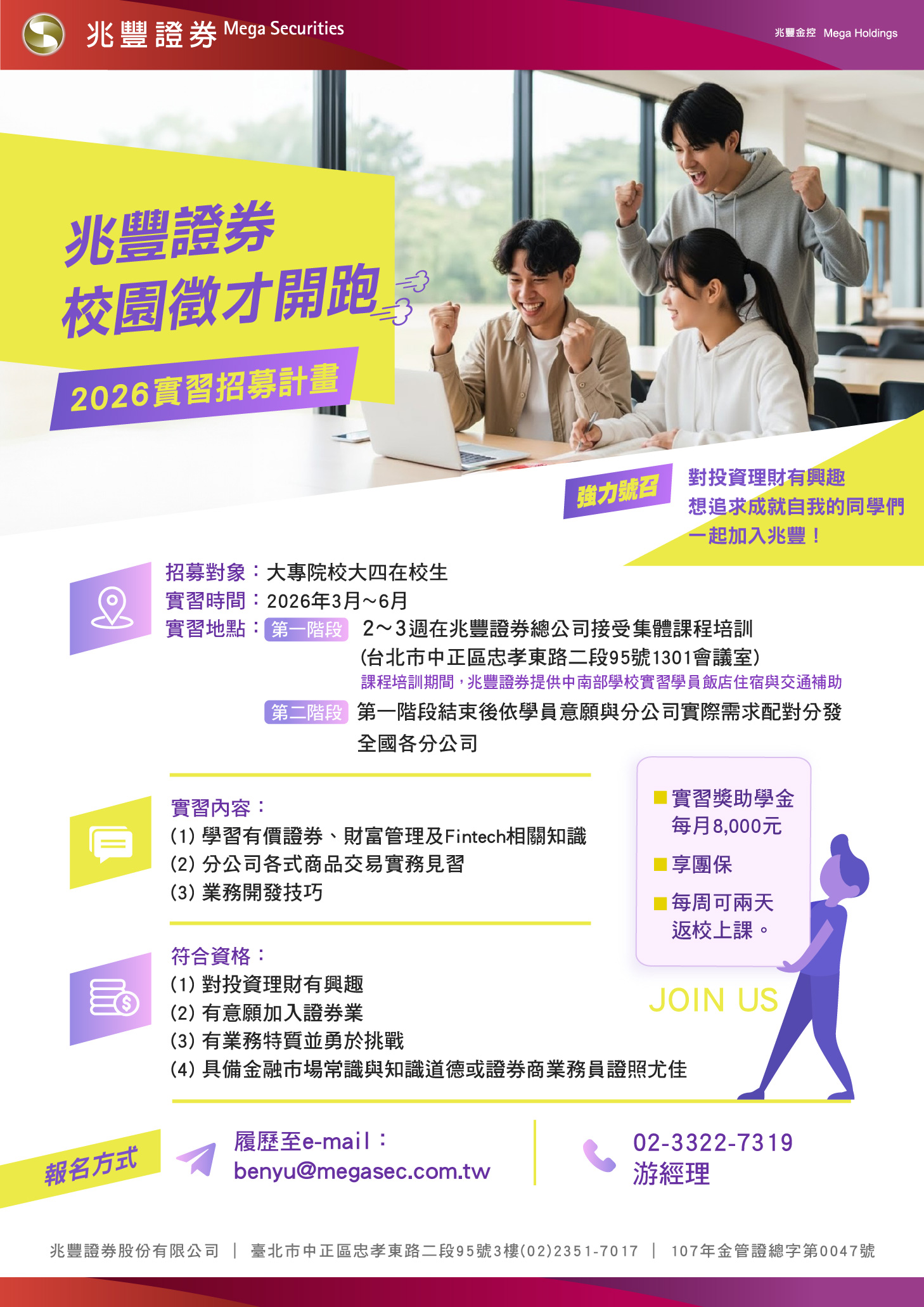 - 檢附本次實習生專案資訊詳如附件。本專案開放大三丶大四及其以上