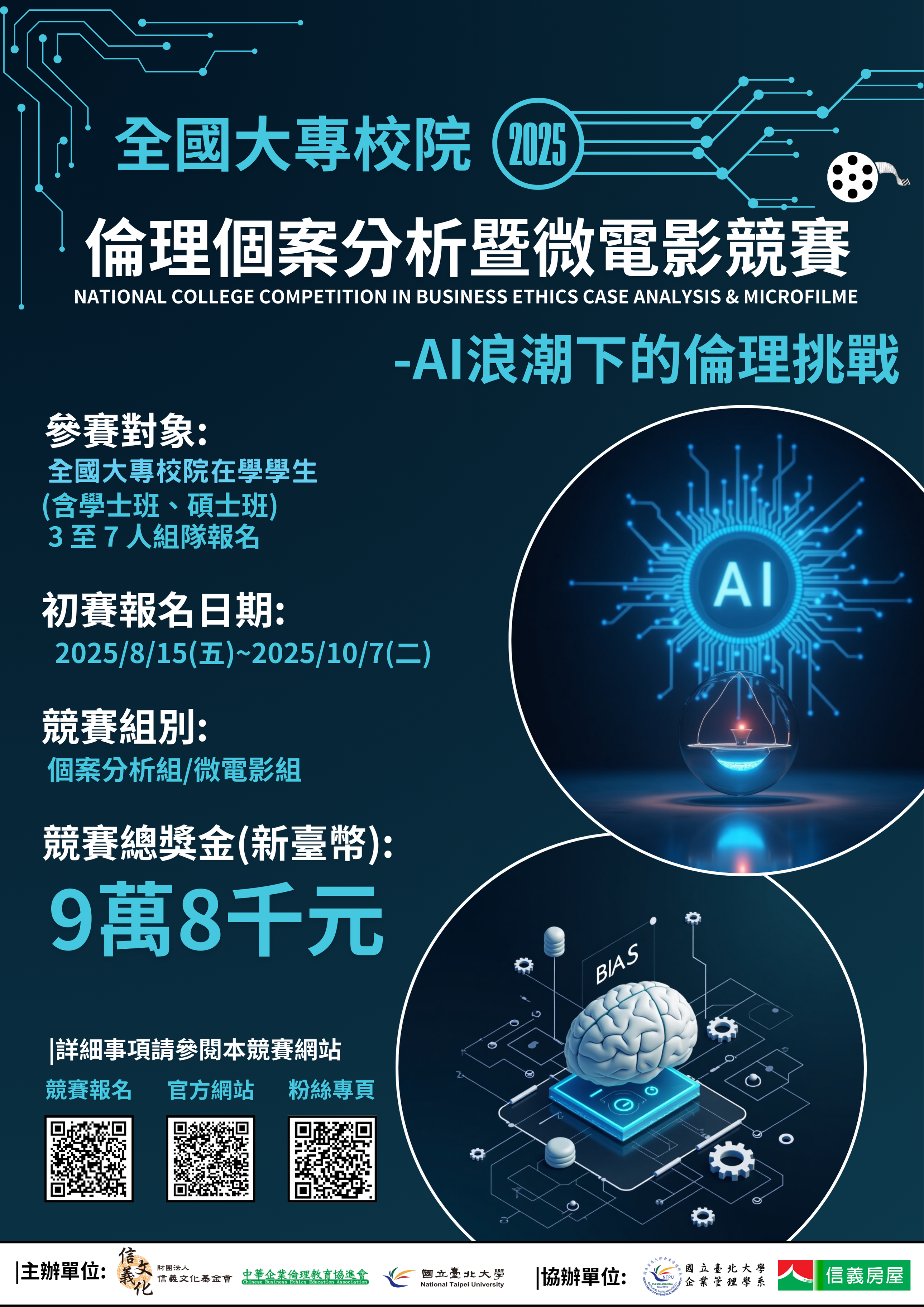 【2025 第十五屆全國大專校院倫理個案分析暨微電影競賽】 報名開跑!今年,我們邀請全國大專校院學生,用 個案分析 或 微電影,探索、解讀、並提出你對「AI浪潮下的倫理挑戰」的見解!活動資訊參賽資格:大專校院學生(含學士、碩士班),3~7人組隊,可跨校系。競賽主題:AI浪潮下的倫理挑戰組別:個案分析組、微電影組報名期間:2025/08/15(五)~10/07(二)23:59賽前線上工作坊:2025/10/17(五)初賽交件:2025/10/26(日)23:59 前決賽交件:2025/12/02(二)17:00 前決賽日期:2025/12/05(五)$$獎金獎狀等你拿第一名:$20,000第二名:$10,000第三名:$8,000佳作六名:獎狀(另有指導老師獎金)刊登時間:2025-09-22 17:15:10