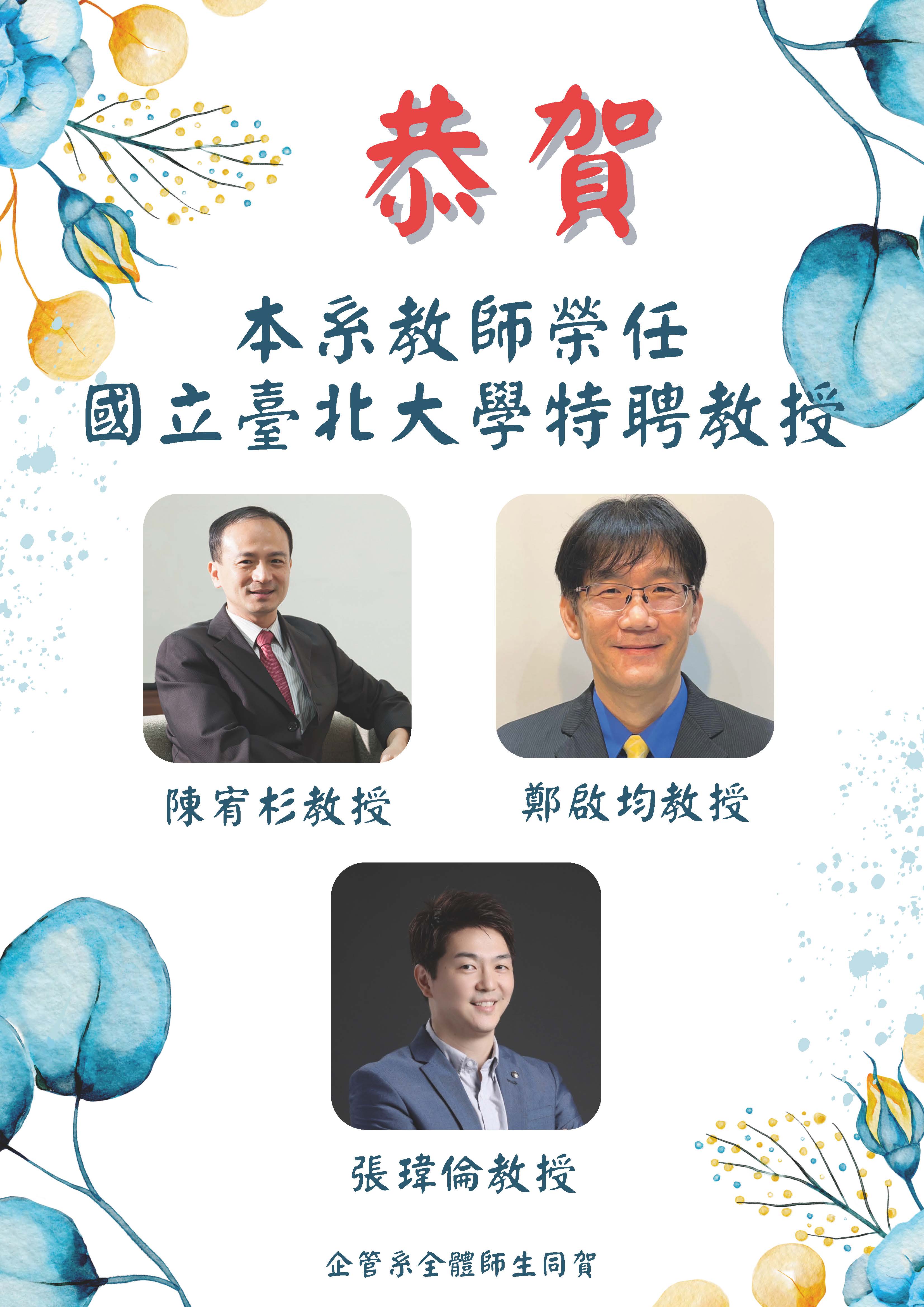 恭賀本系陳宥杉老師、鄭啟均老師和張瑋倫老師榮任本校特聘教授