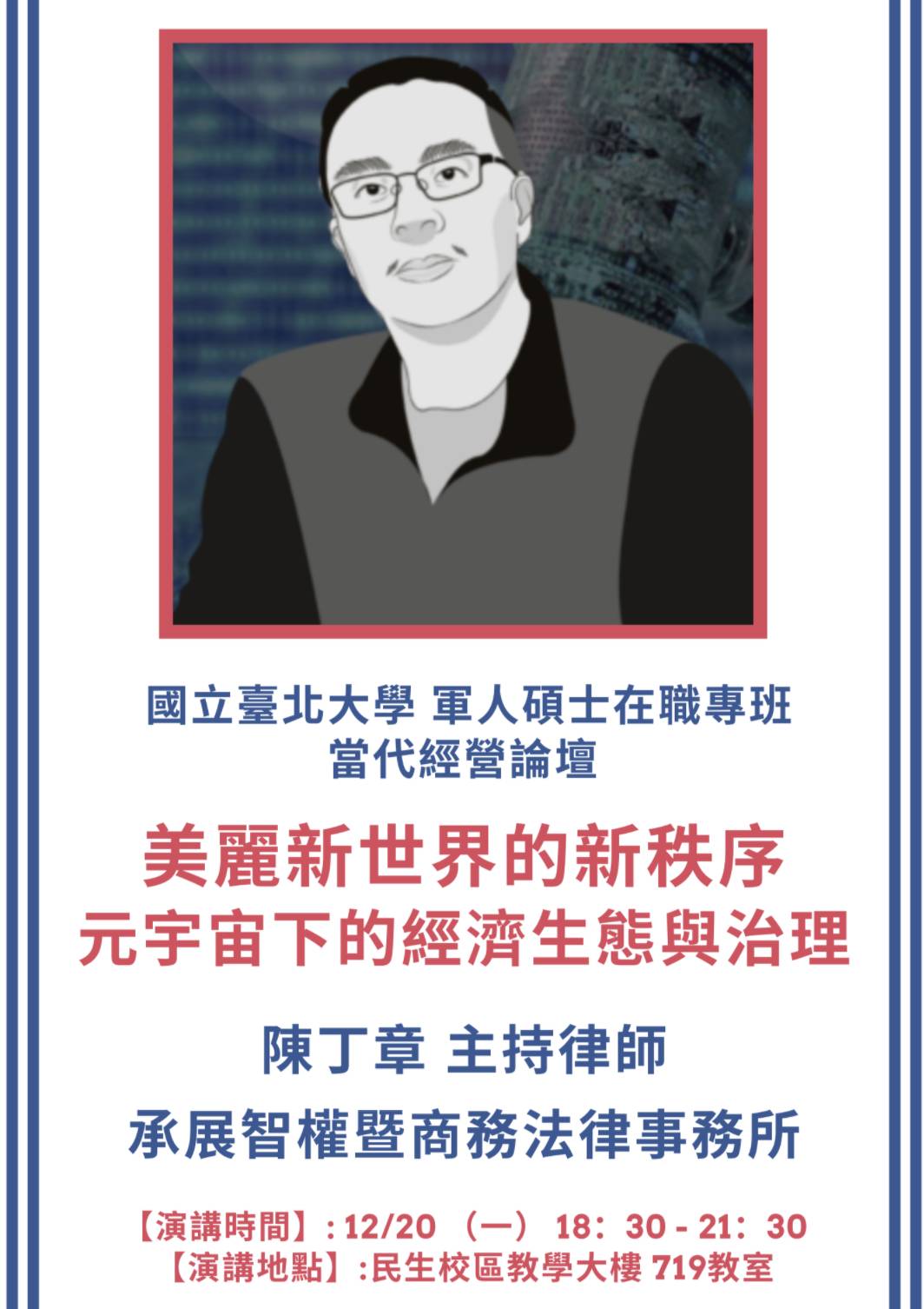 【講座】12/20(一) 18:30-21:30《美麗新世界的新秩序 元宇宙下的經濟生態與治理》 講師:承展智權暨商務法律事務所 陳丁章主持律師